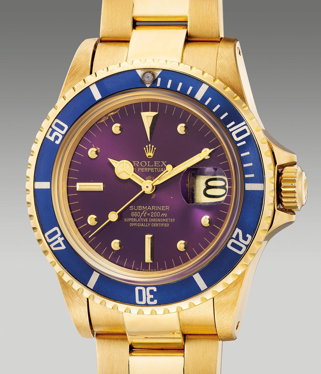 A very attractive and rare yellow gold diver’s wristwatch with center seconds, date, blue bezel, purple “tropical” dial and bracelet