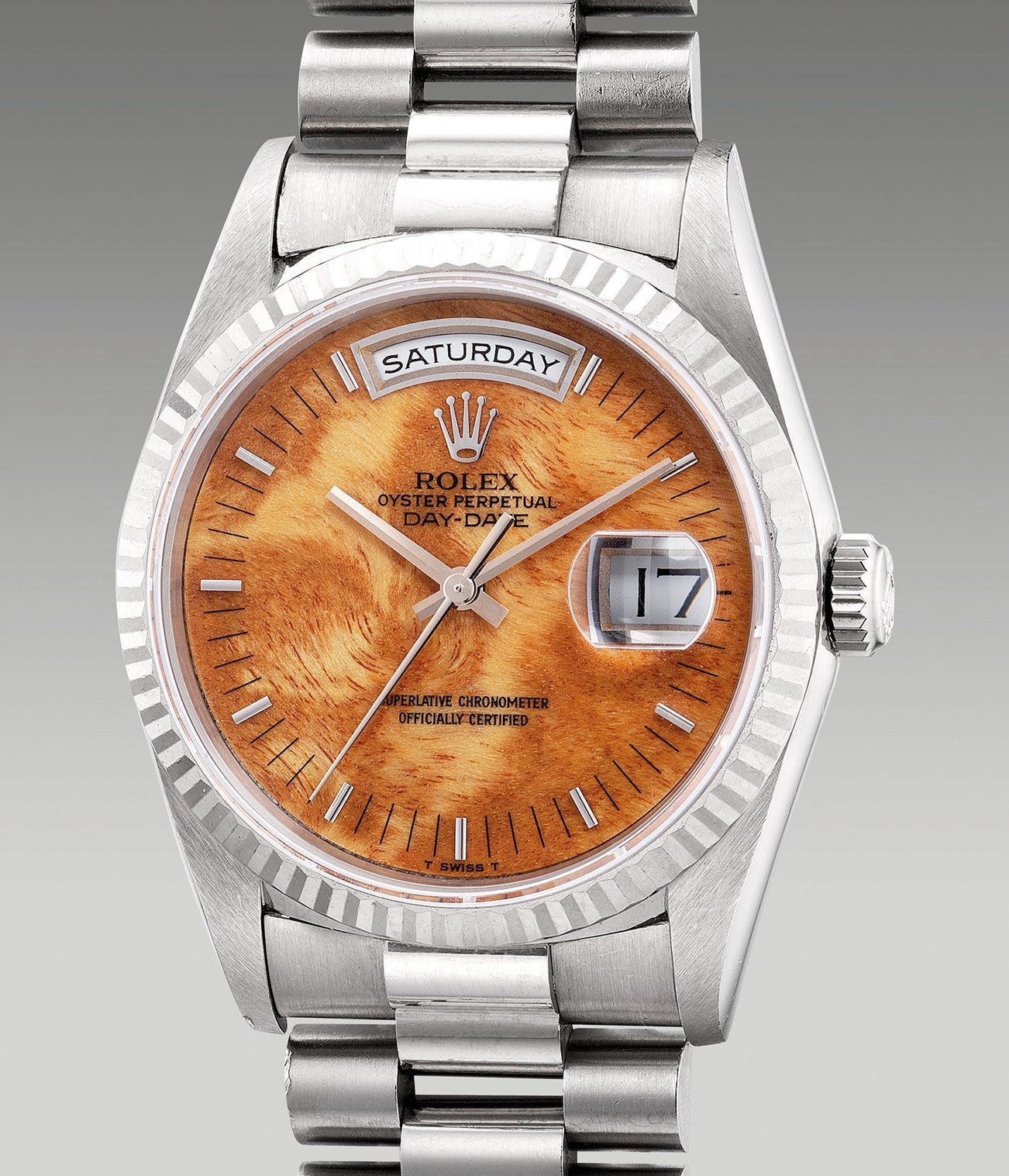 The present example encased in white gold and fitted with a “wood” dial is a rare variant and a specimen of the fathomed artistry of Rolex’s dial creations. Often seen in yellow gold cases, the white gold variant is believed to have produced in much less quantities. Wood dials are extremely hard to work with as they are brittle and for dial makers to cut out apertures or the day and date without fracturing the material requires supreme artisanal craftsmanship to execute.