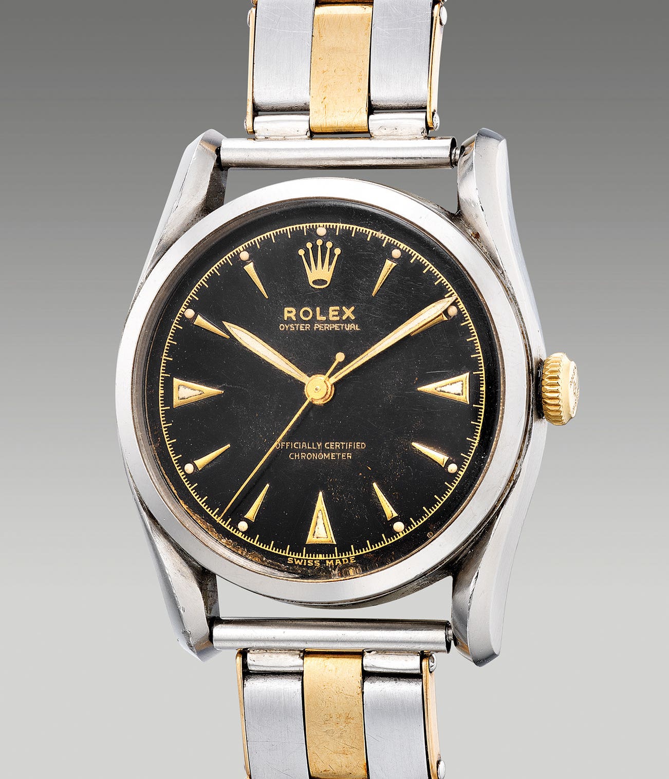 Fitted with a rare black “glossy” lacquered dial, the present example further features a yellow gold Brevet “Oyster” crown, making the case a two-tone variant of the famed “Officially Certified Chronometer” a rare iteration of the reference. The reference number is repeated inside the caseback and with legible numbers in between the lugs.