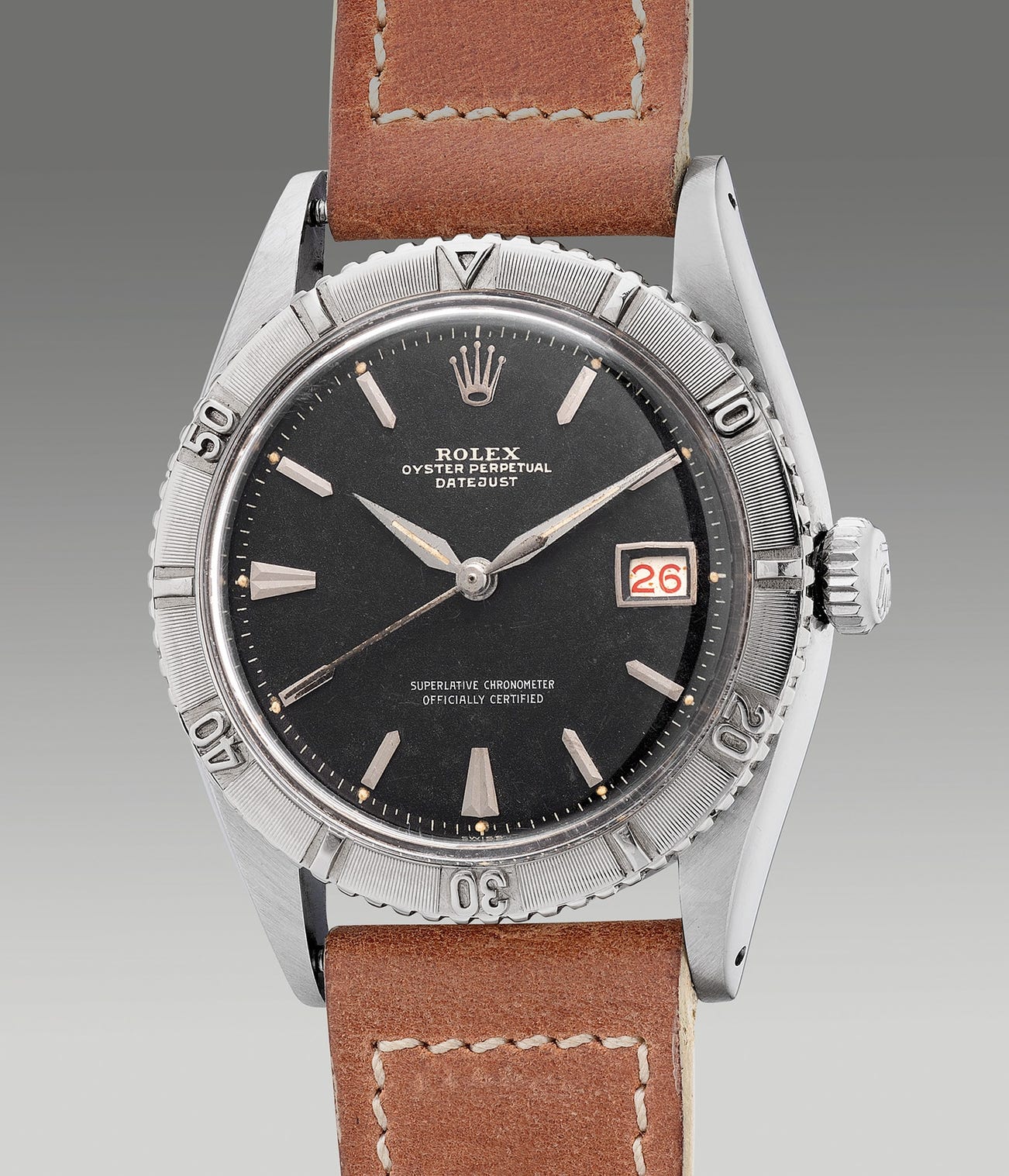 The present reference 6609 is in stainless steel with an 18K white gold bezel, which has taken on a darker patina and contrasts beautifully with the stainless steel case. The clean and original black pie pan dial has lume that has aged well and is a light brown tone, perfectly matching the hands. Additionally, the watch features a roulette date wheel with alternating black and red numerals. Rolex produced the Thunderbird until 2011 when it was removed from their collection. This lovely example from the late 1950s is a wonderful distillation of the early history of the model, and sure to please Rolex connoisseurs.
