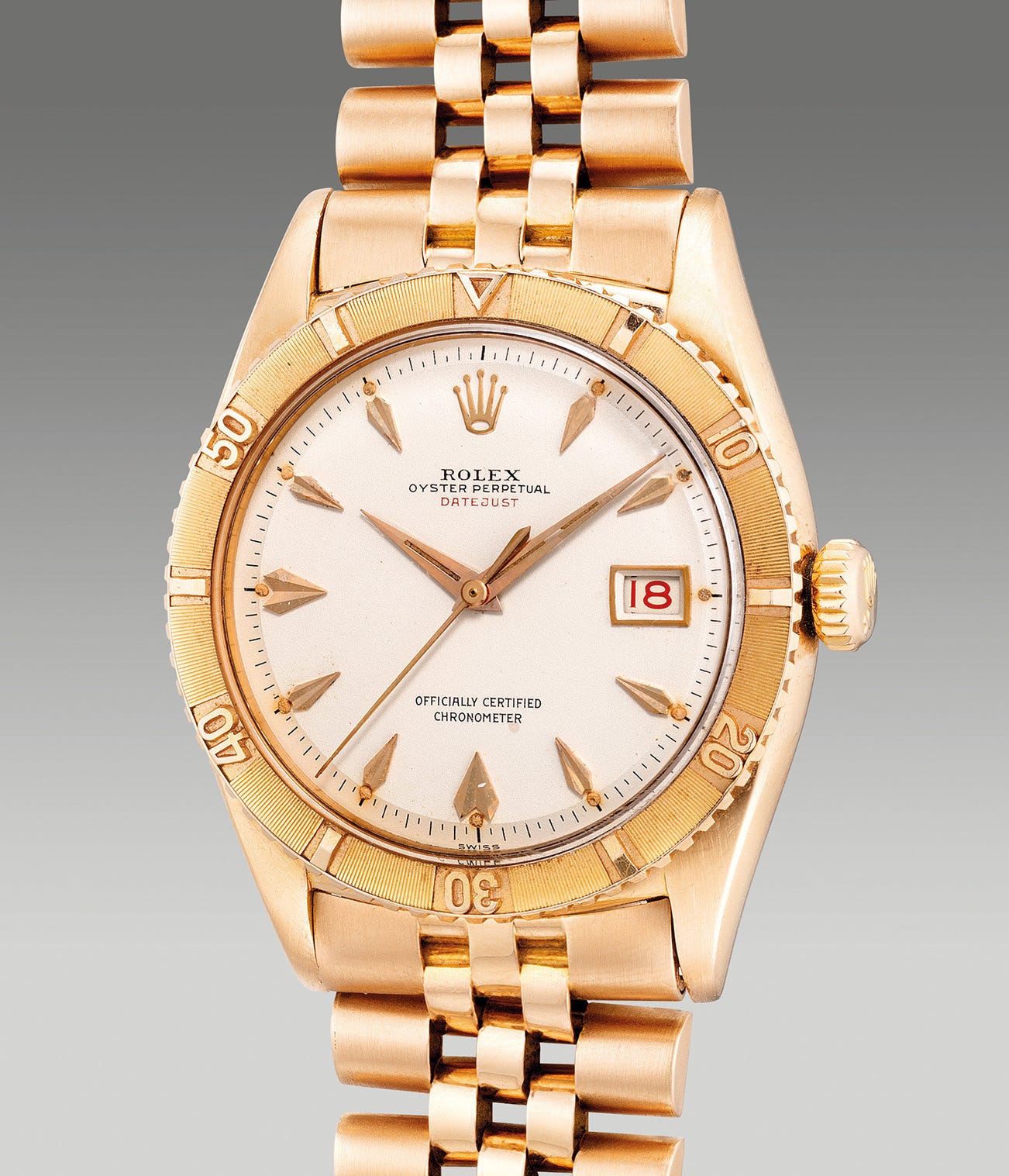 The present example in a rare 18K pink gold case is fitted with the first generation of “Thunderbird” rotating bezel with crisp engine-turned finishing to the surface. Presented in attractive overall condition, the present timepiece is also fitted with the correct crown for the period featuring a Brevet cross embossed below the coronet. Adding to its attraction, the well-preserved dial also features the original “roulette” style date wheel, which is rare on its own today.