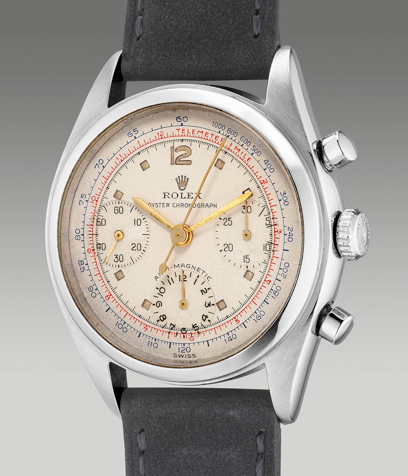 With most examples encased in stainless steel, with some in 18K yellow gold and a small sum in 14K yellow gold made for the US market, stainless steel examples featuring blue tachometer and red telemeter scales on the dial are most certainly rare, which is the case for this present example. Furthermore, the present example features the original “Super Oyster” crown, which were usually changed to a Twinlock “600” crown by Rolex during servicing in the mid 1960’s, indicating the originality of the present timepiece.
