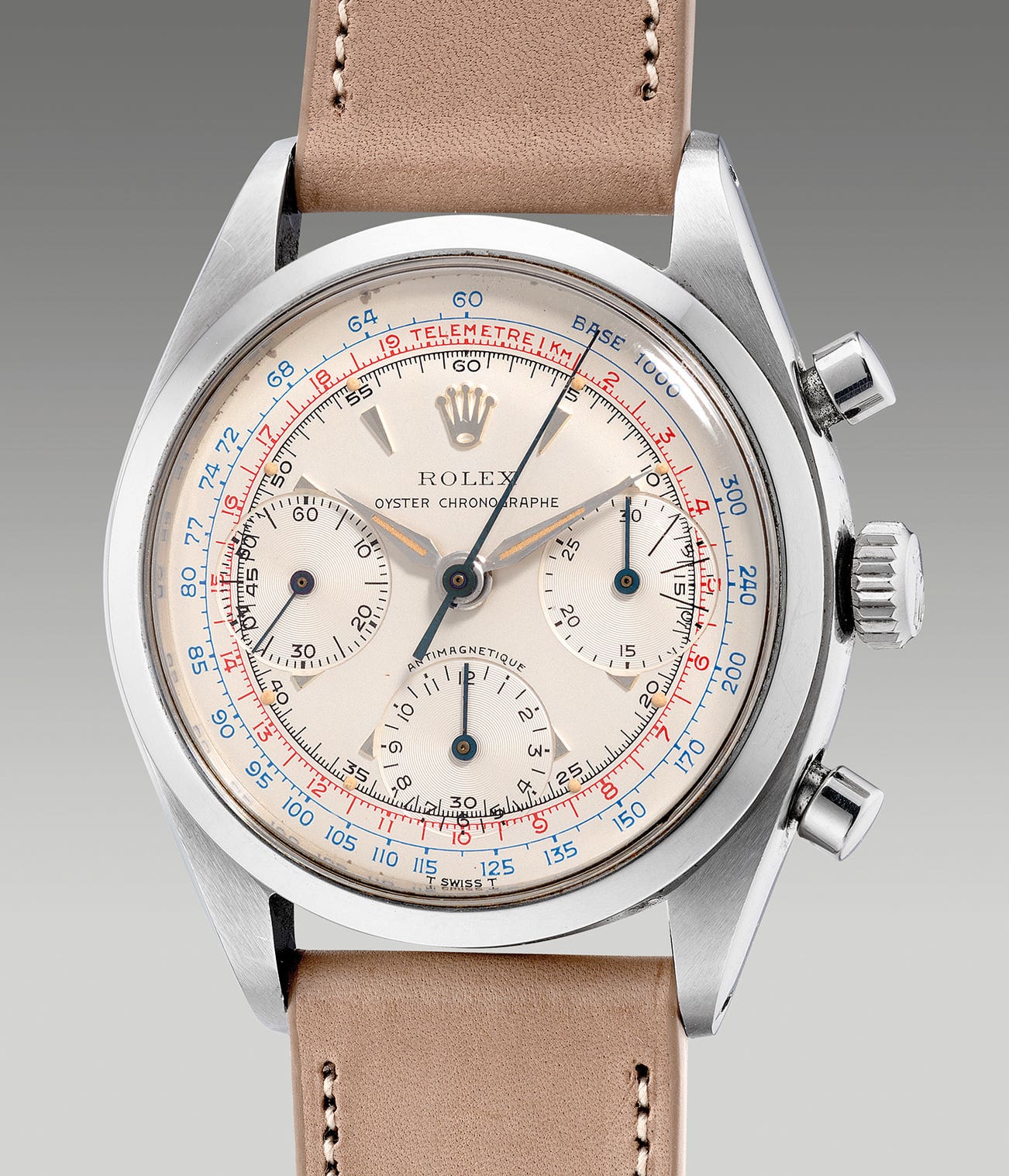 The present example from circa 1959 features the rare iteration of the dial featuring a multi-colored red and blue telemeter scale that has been very well preserved over the years. With red and blue, the dial immediately differs from its monotone counterpart providing the wearer with a heightened legibility. Adding to its attraction, the tritium luminous plots remain intact and have aged uniformly with the luminous material on the hands and remains reactive under UV light.