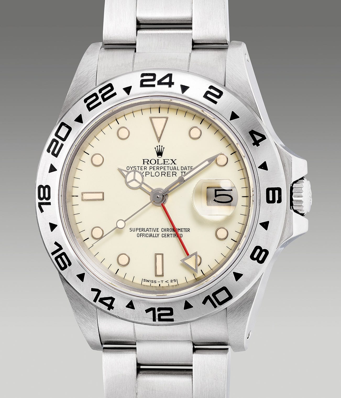 The present example is perhaps one of the earliest examples to be sold manufactured in circa 1984 and was sold by a Japanese retailer on 6th October 1985. Preserved in excellent overall condition, the present specimen is blessed by a uniformed graduation of the cream hue with desirably aged luminous material to a buttery hue and texture giving the watch an exemplified vintage appeal. Furthermore, the present example is well-documented with service invoice and papers from Rolex Japan, its original guarantee and presentation box.