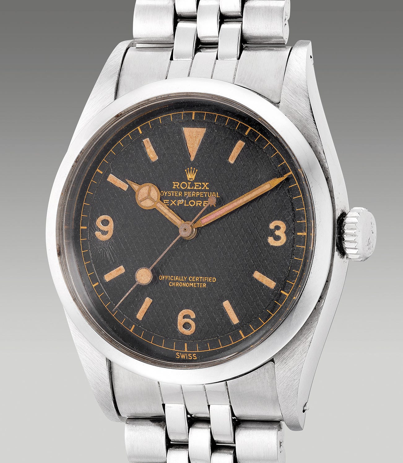A very rare, fine and attractive stainless steel wristwatch with center seconds, ‘Explorer’ honeycomb dial and bracelet