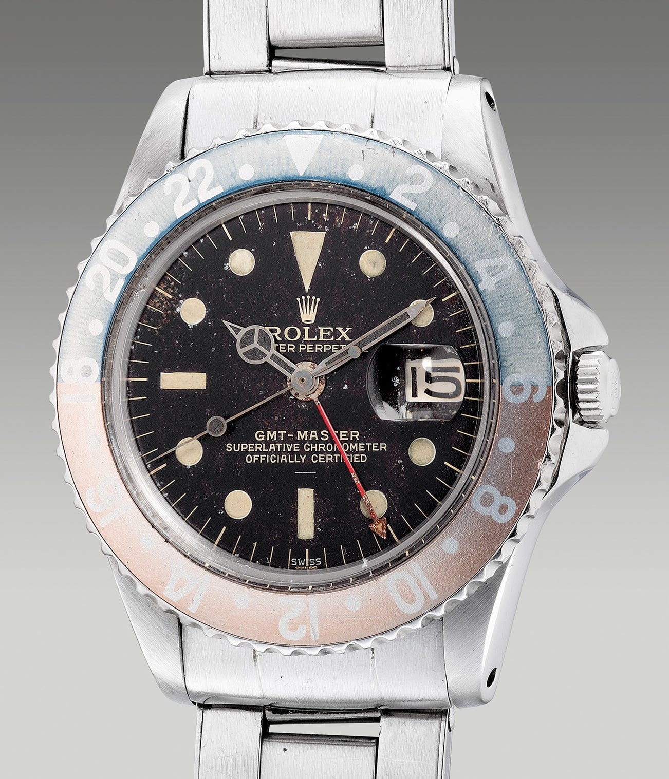 The present example is one of the rarest variations of an early example of the reference. From circa 1962, the numbers in between lugs are stamped 876 thousand correlating with the typical configuration witnessed. Extremely rare, the present example features a “tropical” gilt underline double “Swiss” dial with pointed crown guards. Fitted with already a rare dial, the pointed crown guards further confirms the period of the timepiece as well as heightening the rarity of this particular piece. Pointed crown guards were used by Rolex for a very short period of time until they upgraded it to a rounder overall design. Adding to its attraction, the present GMT-Master ref. 1675 is accompanied by the original Rolex Japan guarantee, Rolex Japan service invoice from 1975 and 1981 as well as the original service receipt, hang tag, extra gasket and original presentation box.