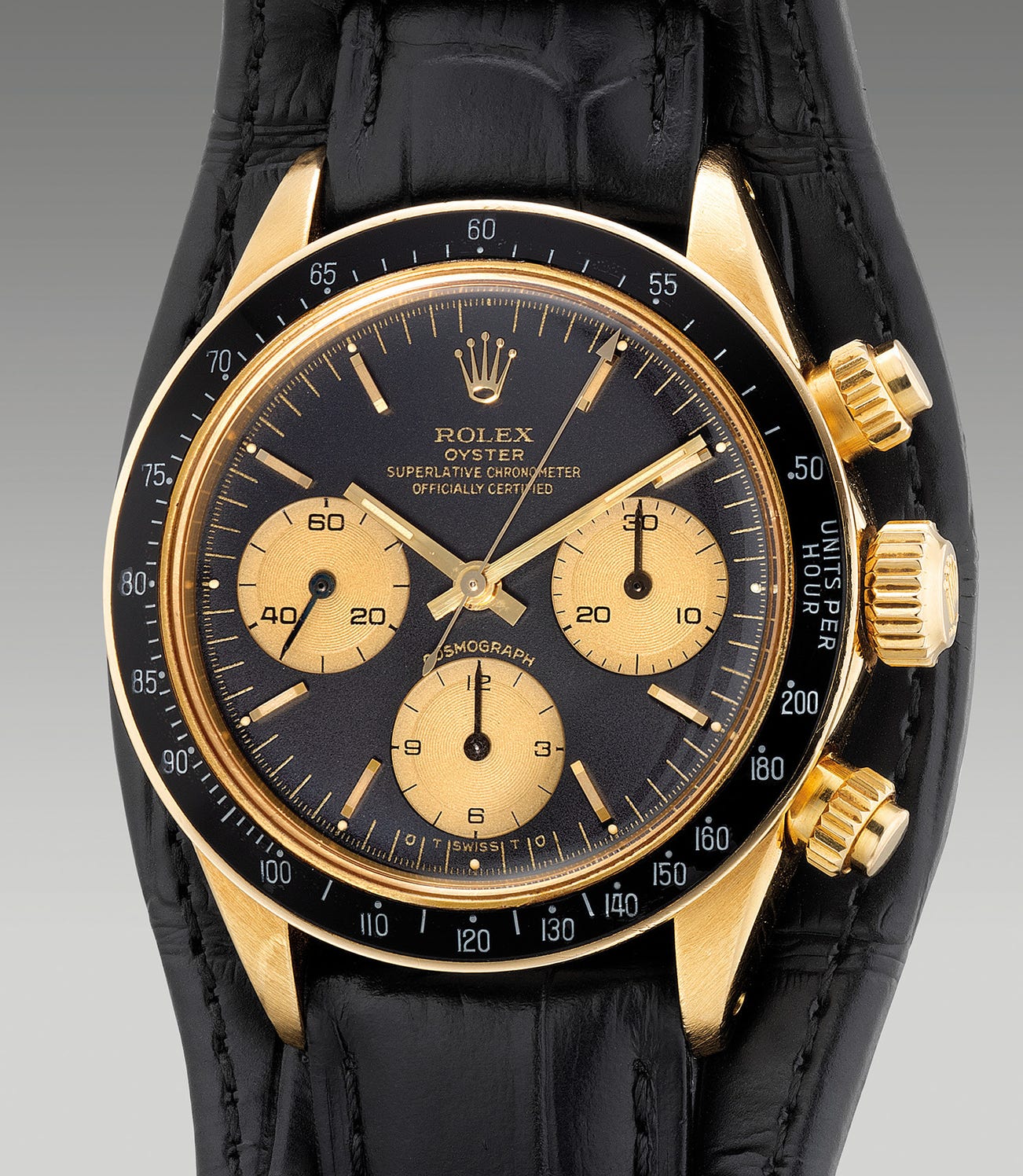 The Daytona is sought after for its versatility, durability and modern aesthetic. It is a watch that can be worn by sportsmen or businessmen alike and looks just as suitable at the beach as in the boardroom. The present 18K yellow gold timepiece is extremely well preserved, looking as original as it did the day it left the factory. The case is possibly unpolished and has strong proportions with crisp hallmarks to the undersides of the lugs. The dial is notable for its “sigma” T Swiss T signature at the bottom indicating the hour markers are made of yellow gold. Furthermore, it has a strong masculine appeal with the gold lettering and gold hands complimenting the black background. The sandy brown lume plots match the hands, and are intact.