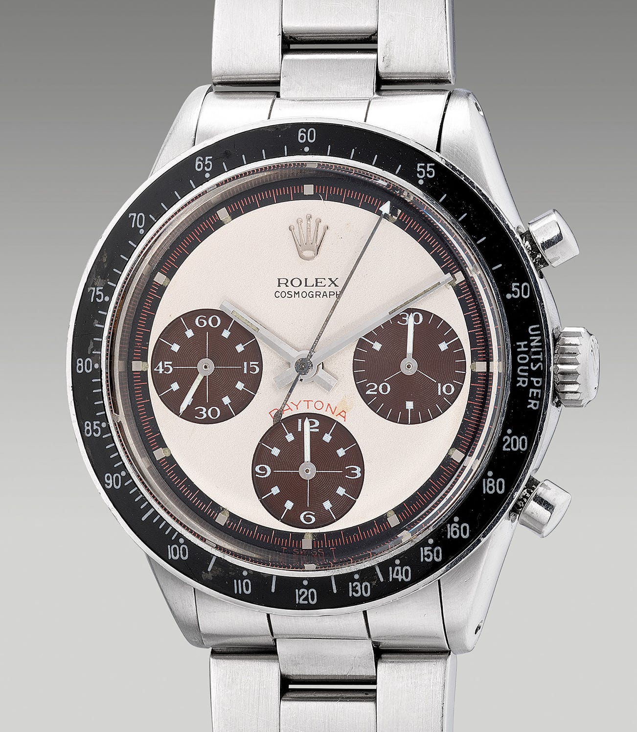 A very fine and rare stainless steel chronograph wristwatch with “Paul Newman” dial, brown “tropical” subsidiary registers, tachymeter bezel and box