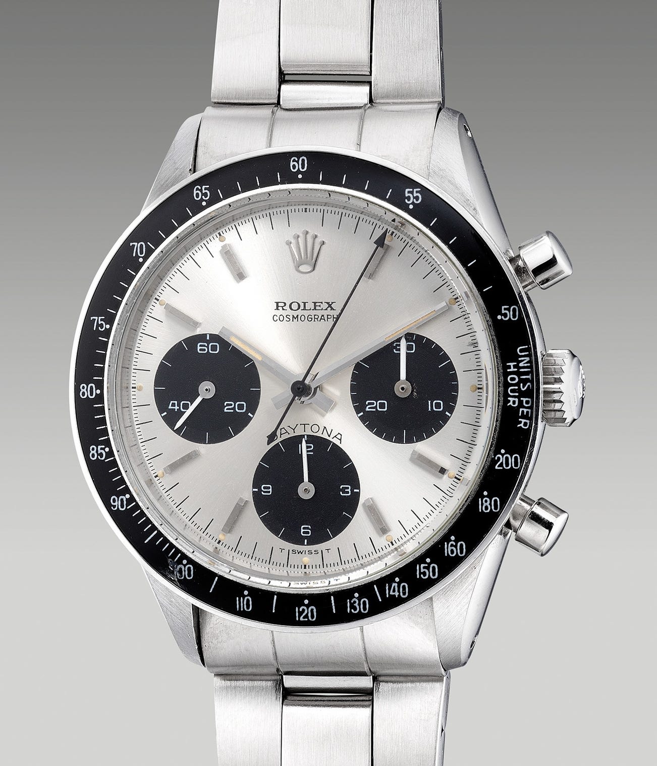 A very fine and rare stainless steel chronograph wristwatch with silvered soleil-finished black “Daytona” dial and bracelet