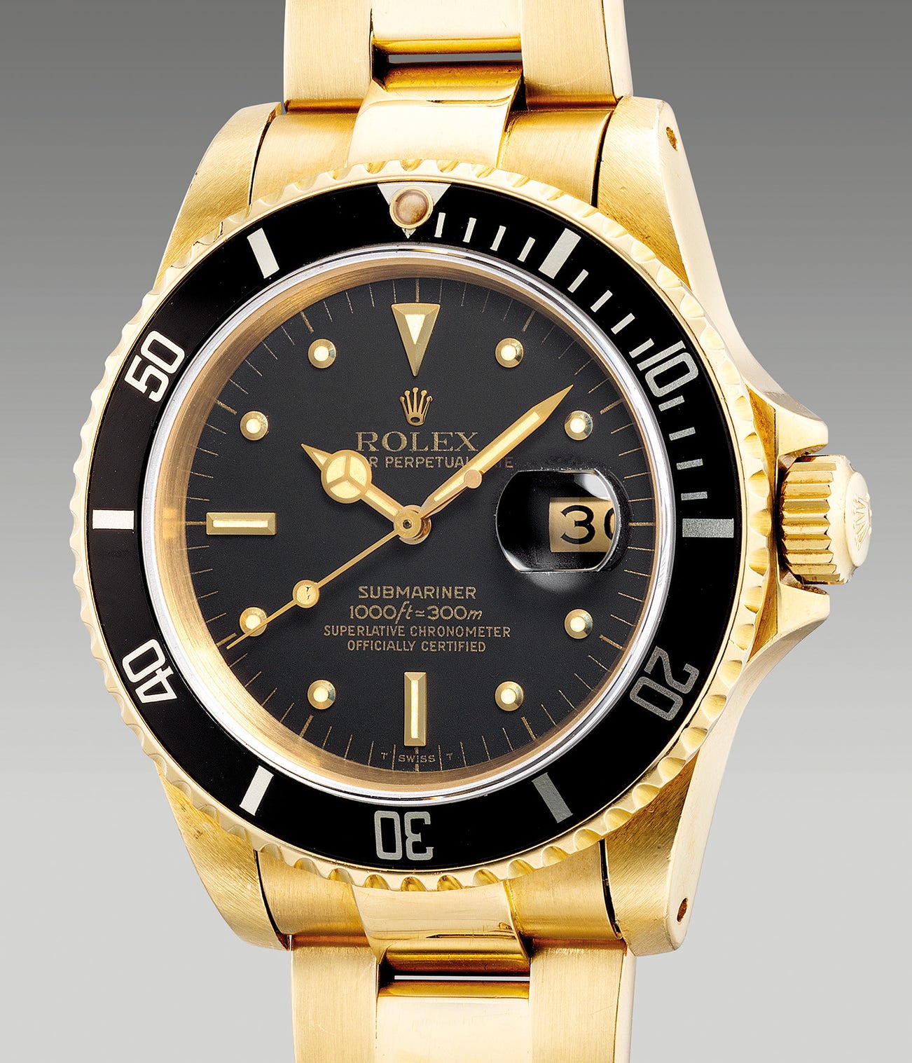 The present example with a black dial is preserved in attractive overall condition and bears an 8.1 million case number indicating it as an example from circa 1983. Fitted with an attractive dial, the present example is a nice transitional example of a vintage gold Submariner with modern upgrades.