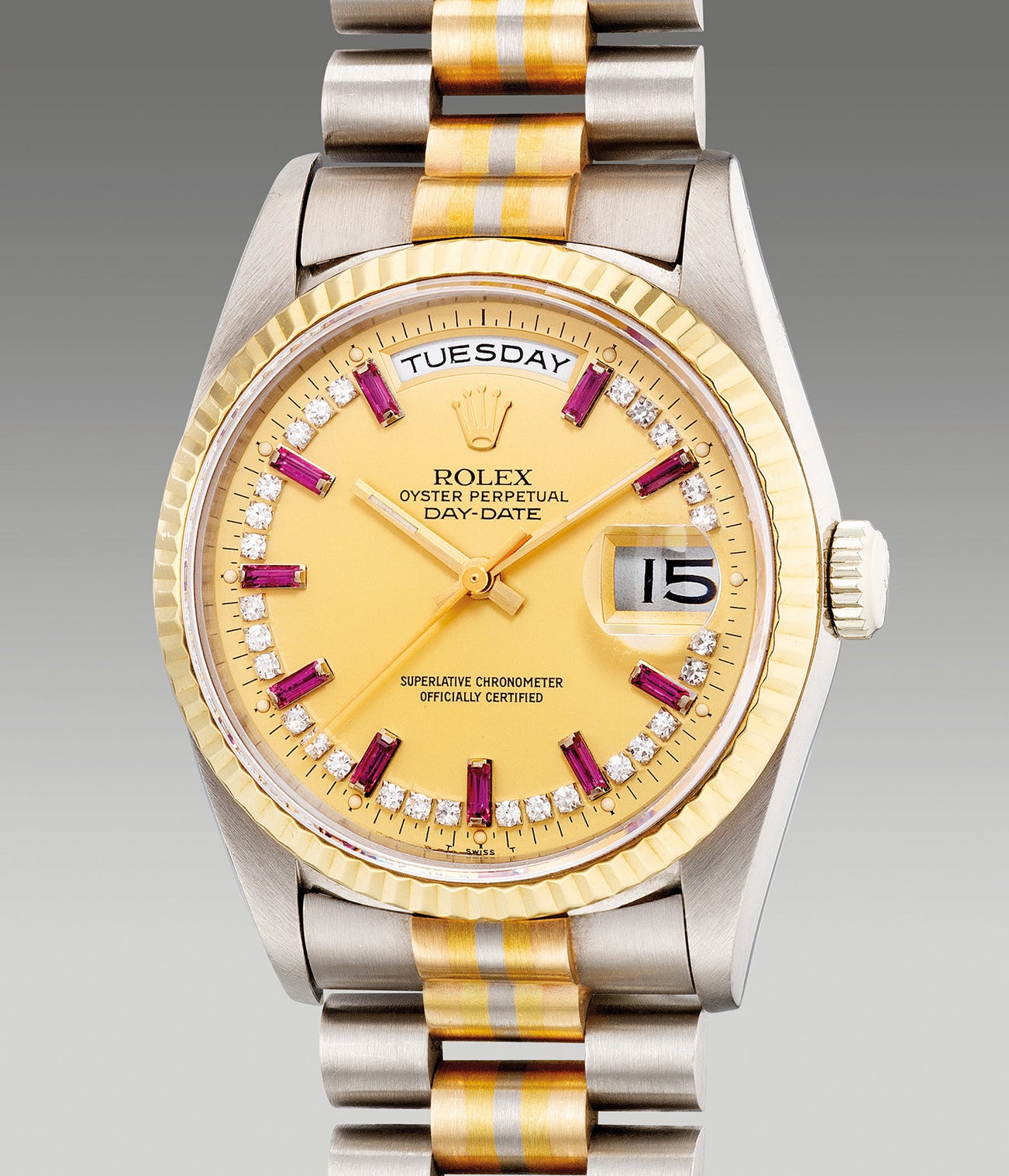 The present two-tone example features an attractive and desirable ruby and diamond-set indexes against a champagne gold dial matching harmoniously with the Tridor bracelet. Furthermore, the ref. 18239B features the upgraded cal. 3135 with double quick set function allowing the wearer to adjust the day and date with much ease.