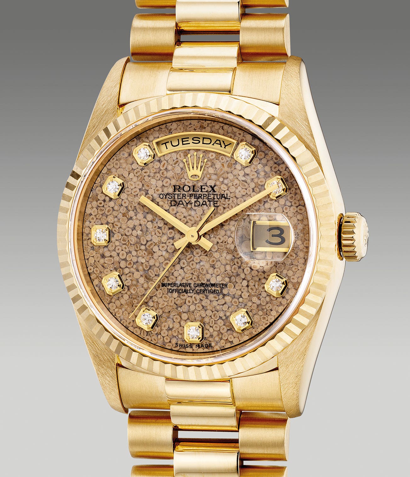The ref. 18238 was introduced in 1988 with an upgraded cal. 3155 featuring a double quick-set function for the day and date. With aesthetics similar to its forefather, the reference was available with regular dials and various hardstone dials. The present example fitted with a “Jurassic” fossil dial with diamond-set indexes belongs to the hardstone family. Extremely delicate to work with measuring a mere 2.5 on the Mohs scale of hardness, it requires tremendous craftsmanship and precision to execute the feat.