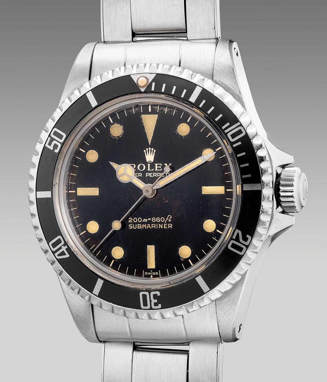 The present example from circa 1964 is presented with a “glossy” black lacquered dial with “meters first” “Swiss” dial and features pointed crown guards witnessed in early examples. Bearing a 1 million serial, the features mentioned are appropriate for examples within the range. Presented in attractive overall condition, early examples of the ref. 5513 are among one of the most sought after vintage Submariner models due to its rare and attractive nature of its glossy black dial and its extinct and desirable pointed crown guards.