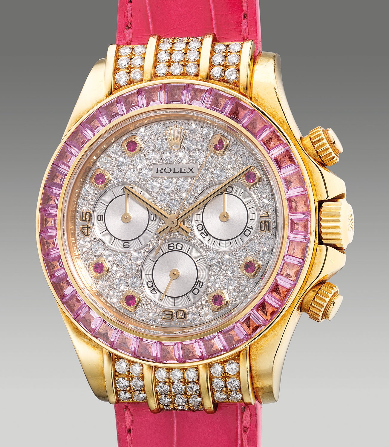 Adorned with 36 baguette-cut pink sapphires set uniformly on the bezel with grace, the technical prowess with rigorous standard in quality is a sight to behold. The hoods between the lugs are also embellished with brilliant rows of diamonds. Encapsulated among these opulent decorations, the dial is further fitted with an iced-out diamond-set dial with 8 beautiful hour markers set in rubies with yellow gold surrounds. While most examples of the reference in yellow gold featured gold chronographic registers, the present example features a silver register dial that was born originally with the present timepiece and is further confirmed by the discovery of the second example featuring the same reference and dial configuration as the present. Referenced 116598SARO, "SARO" is Rolex's code for "baguette-cut rose sapphire" for the bezel.