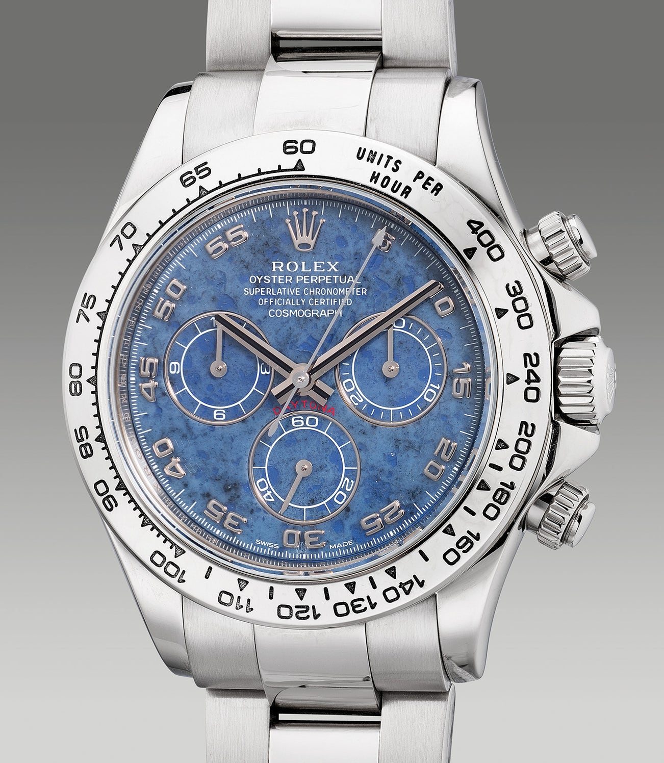 Exuding a sporty vibe with a touch of luxury, the present Daytona ref. 116509 in white gold features a beautiful blue sodalite dial with Arabic numerals in a 5-minute configuration for enhanced practicality when activating the chronograph. Preserved in attractive overall condition and complete with its full set of accessories, this sought after timepiece will surely garner interest from collectors looking for a Daytona with a touch of flare.