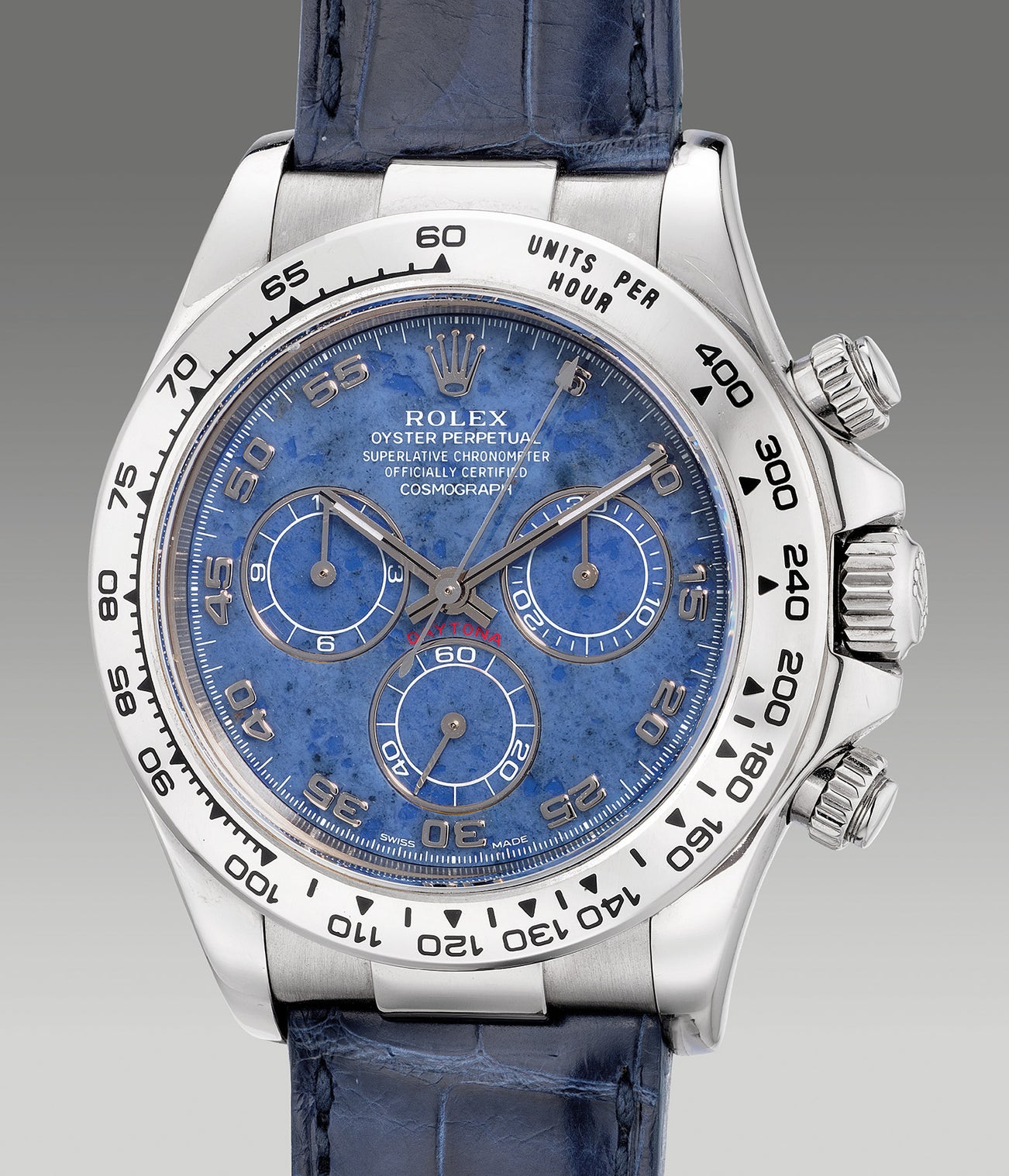 Hardstone dials have always been an interesting feature in Rolex timepieces and the Cosmograph Daytona ref. 116519 with a blue sodalite dial is certainly one of them. With a vitreous luster, sodalite measures 5.5 on the Mohs scale of hardness making it a tough material to work with requiring extreme precision only executable by the most experienced dial makers. Adding a luxurious flare to the coveted Daytona, the present example ref. 116519 with a blue sodalite dial is certainly one that is garnering much interest by collectors today. Offered with its original guarantee and presentation box, the present example was originally sold by a local Hong Kong retailer.
