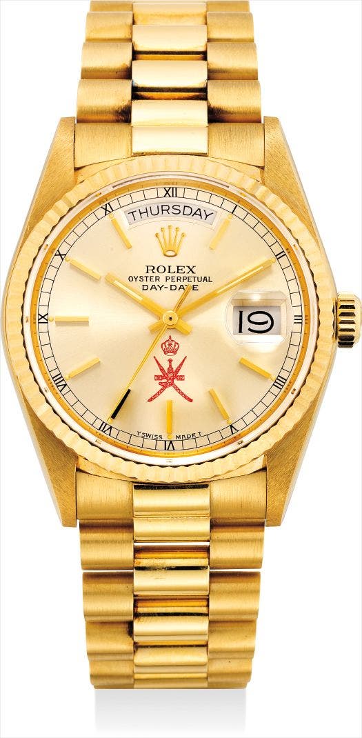 A very fine and rare gold calendar wristwatch with khanjar dial bracelet, made for the Sultanate of Oman