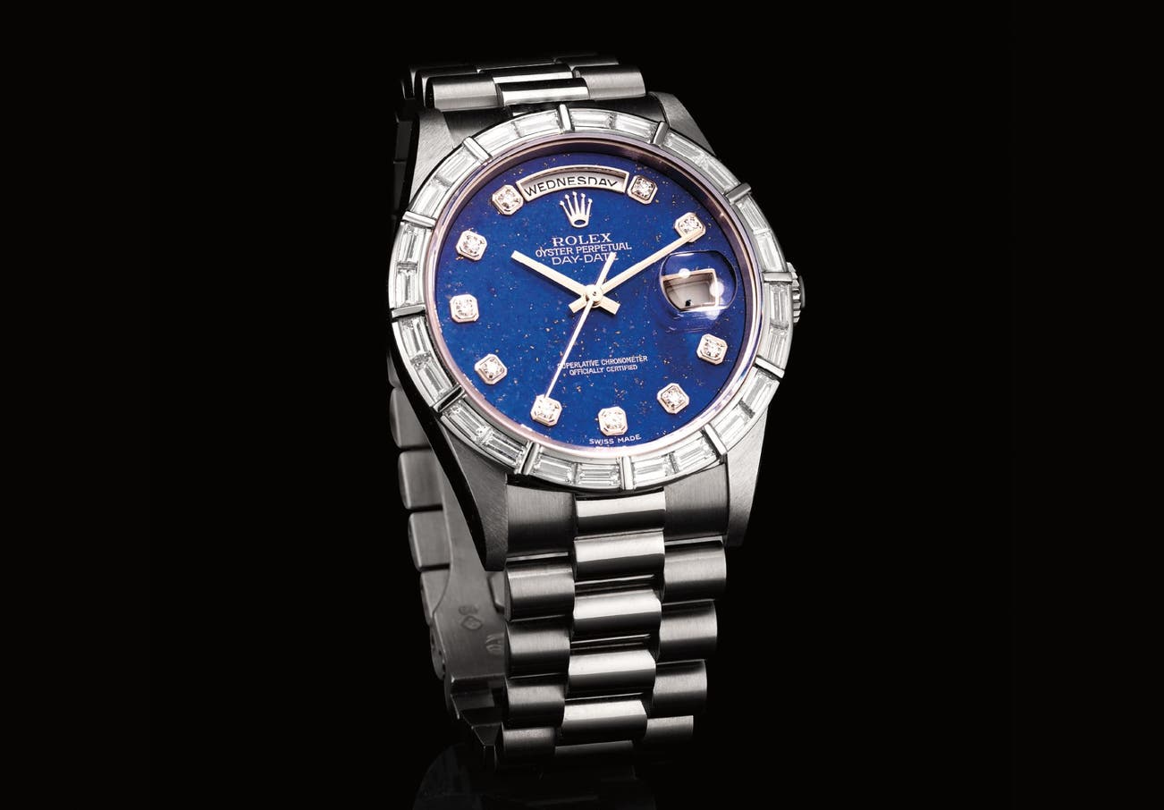 A very fine and rare white gold and diamond-set wristwatch with day, date, sweep centre seconds, lapis lazuli dial and bracelet, original guarantee and presentation box