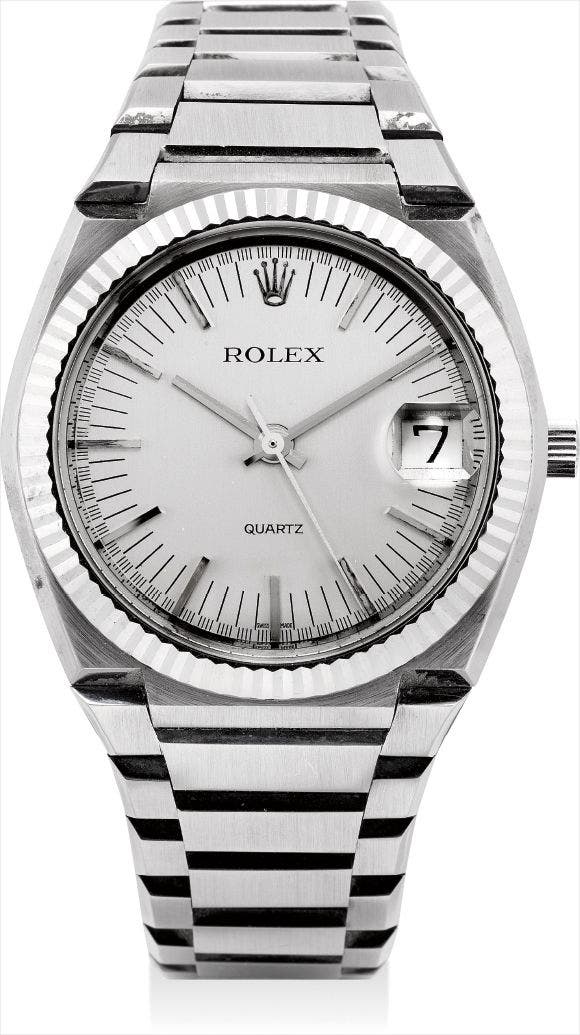 The present example features a large heavy case, enhanced by its white gold bracelet and fluted bezel. Today, it is in lovely preserved condition for a watch that is approximately 45 years old. The case remains unpolished with sharp case and lug edges, along with a strong hallmark. While there is wear to the watch, it has a masculine appearance on the wristwatch. This is rare opportunity to own a wonderful example of one of early examples of quartz horology.