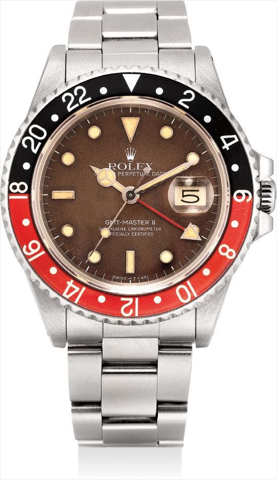 The present example shines with it lovely chocolate brown ‘tropical’ dial, and luminous material that has faded to a crème yellow. In nicely preserved condition, the watch is complete and features the original sale receipt from 1986.