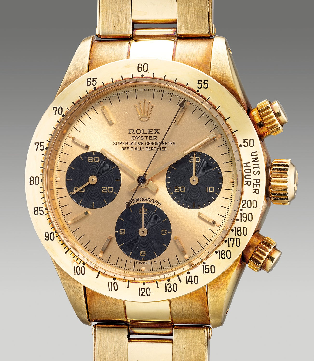 In the early 1970s, Rolex introduced the ref. 6265 together with its counterpart ref.6263 enjoying a lengthy production spanning almost 20 years ending in 1987. Throughout its production span, it is estimated that not over 2,000 examples of the reference were encased in yellow gold. From the late 1970s and onwards, gold examples featured a movement number engraved on the plate behind the balance wheel. Research suggests that this was related to the officially certified chronometer movement. Around this period, Rolex modified the dial layout for gold versions, and the ‘OCC’ designation was printed on the dial.