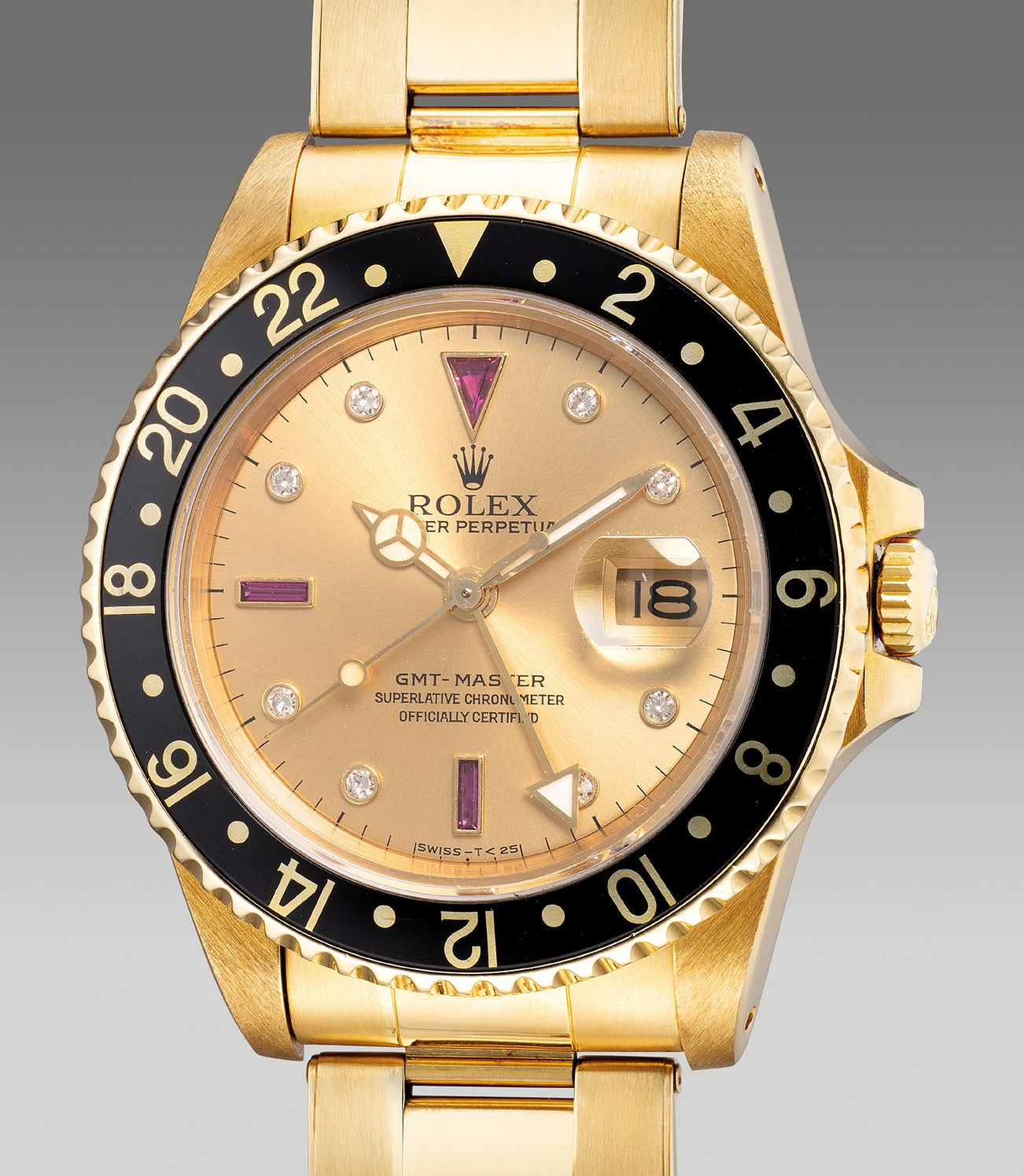 The present example Rolex GMT-Master ref. 16758 from circa 1988 features a beautiful and rare gold dial with diamond and ruby-set hour markers referred as a “Serti” dial and is offered in attractive condition and complete with its full set of accessories.