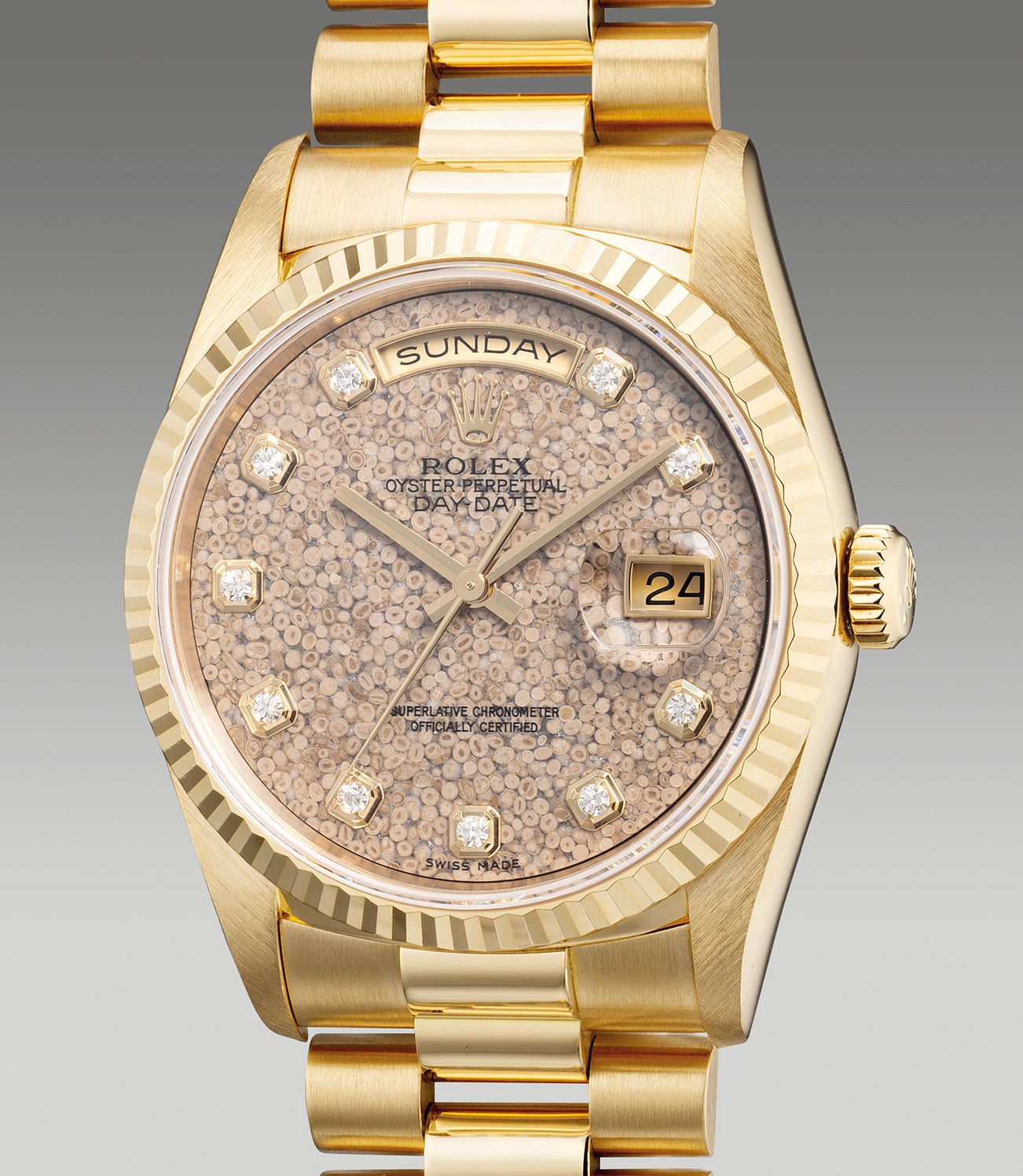 Offered in excellent overall condition boasting a sharp case and a flawless dial, the present example Rolex Day-Date ref. 18238 with the rare and delicate Jurassic fossil dial from circa 1999 is complete with its original guarantee and presentation box.