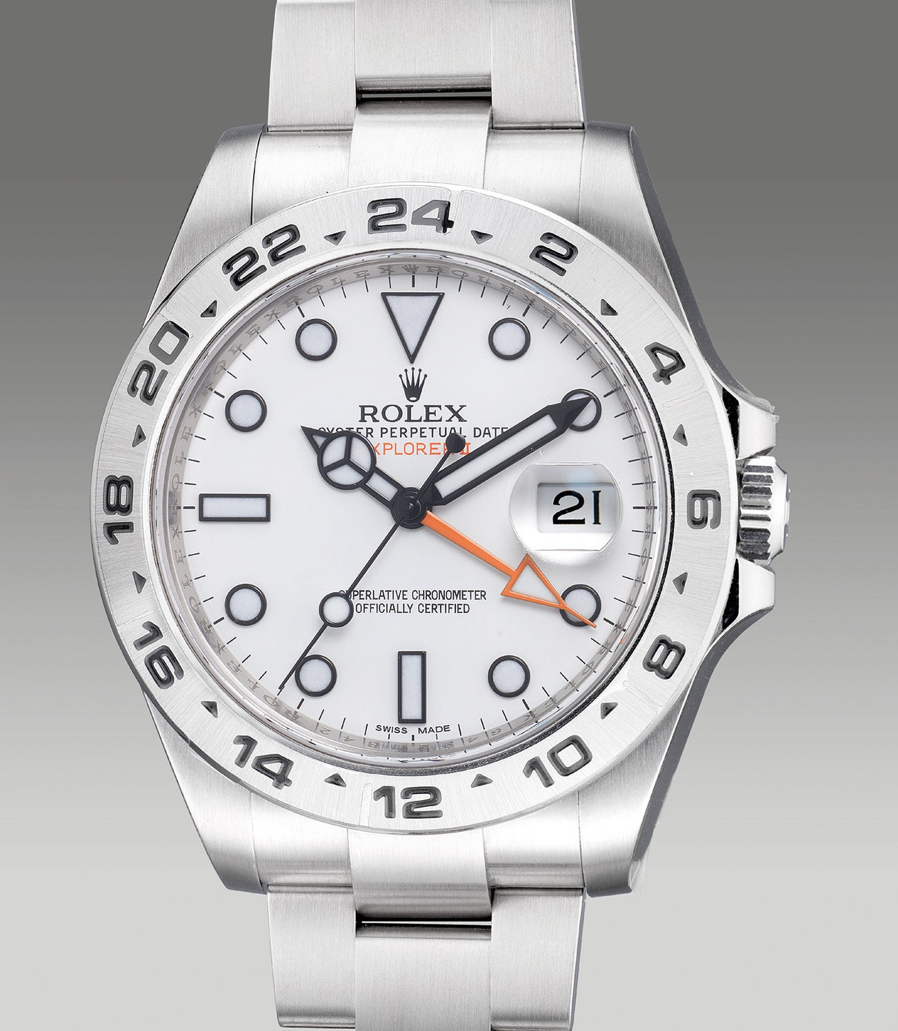 The present example Rolex Explorer II ref. 216570 with a white dial from circa 2014 is offered in “new-old-stock” condition with its full stickers intact. With a “Khanjar” engraved caseback, the present example sold through the Sultanate’s retailer Khimji Ramadas was made as a gift to the Sultanate’s dignitaries and servants. The present lot is complete with its original guarantee and box with its outer packaging stamped with the emblem of the Sultanate of Oman.