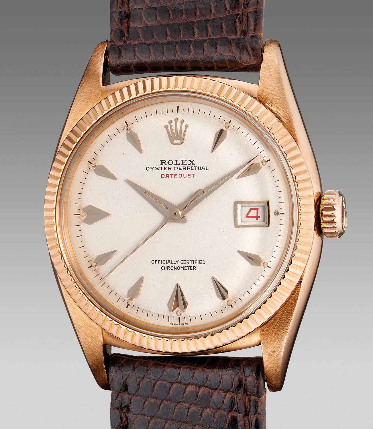 The present example Rolex Datejust ref. 6305 in its rare and attractive pink gold case from circa 1954 features an attractive white dial with fancy applied gold indexes that mimics the shape of a paper plane. Another interesting feature is its roulette date wheel indicating even numbers in red and odd numbers in black. Well-preserved, the watch was probably only worn not more than a handful of times throughout its lifetime.