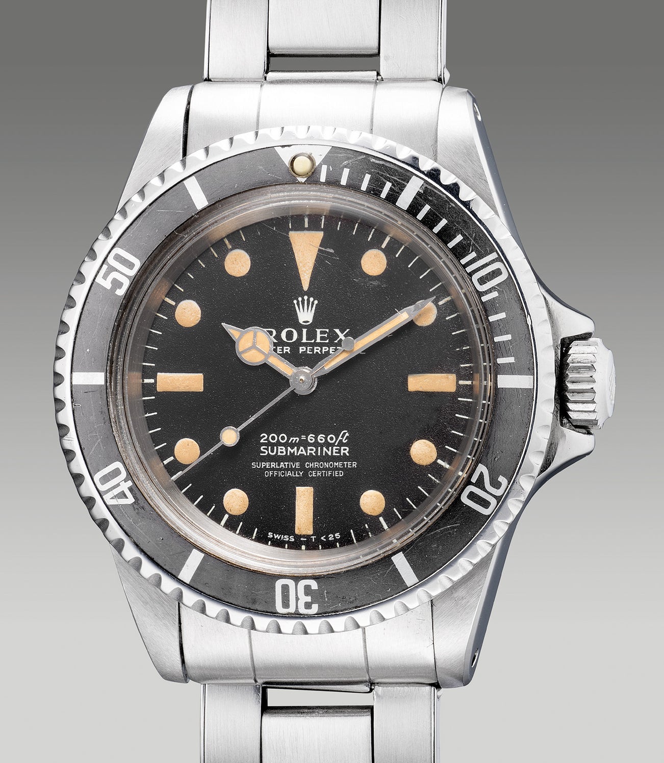 The luminous material on this present lot has wonderfully aged into an even warm orange buttery hue. Offered in well-preserved condition, fitted with a nicely faded ‘Long 5’ insert and a beautifully aged dial and further accompanied with a riveted Oyster bracelet, this is a highly desirable example of a vintage Rolex Submariner.