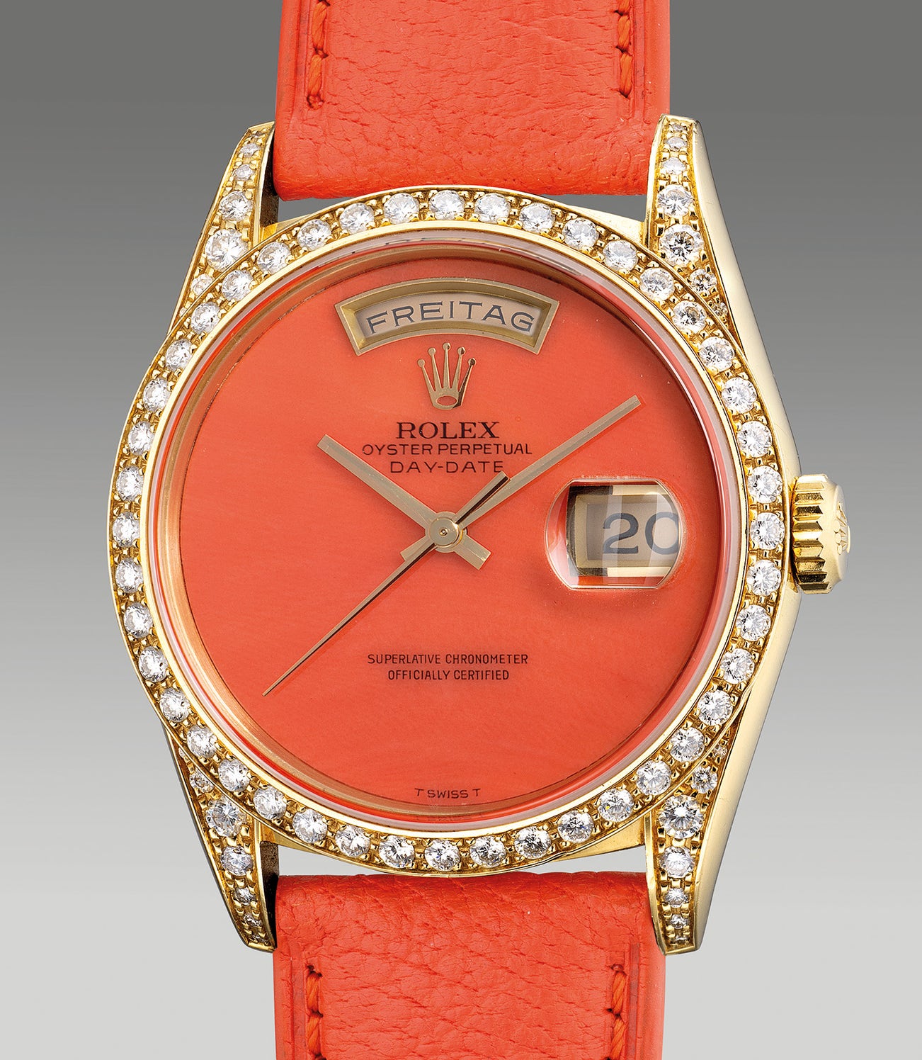 The present example Rolex Day-Date ref. 18388 from circa 1994 featuring a diamond-set case including the lugs displays a beautiful coral dial. A very rarely seen configuration, the combination of the bedazzled case against its orangey-pink coral dial with the absence of any indexes and outer tracks certainly brings out the beauty of the dial.