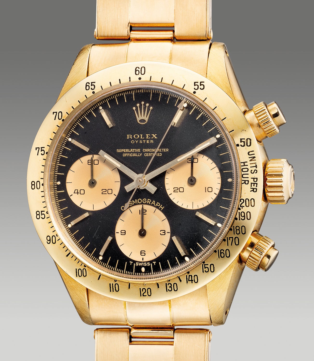 Not your everyday find, the present “Oyster-Split” ref. 6265 bears a 3’960’XXX serial produced from circa 1975 is preserved in stunning condition and retains the ‘MK 1’ chronograph pushers. The contrast of the yellow gold case which has gained a warm patina over the years clashes beautifully against the handsome champagne registers on its black dial. Furthermore, a delight to collectors, the luminous markers remain perfectly preserved and intact. A similar example was sold at PHILLIPS Daytona Ultimatum auction Lot 28 for CHF287,500. Extremely desirable and sought after, the present example fitted with the rare dial will certainly garner interest from the dedicated collector of vintage Rolex.