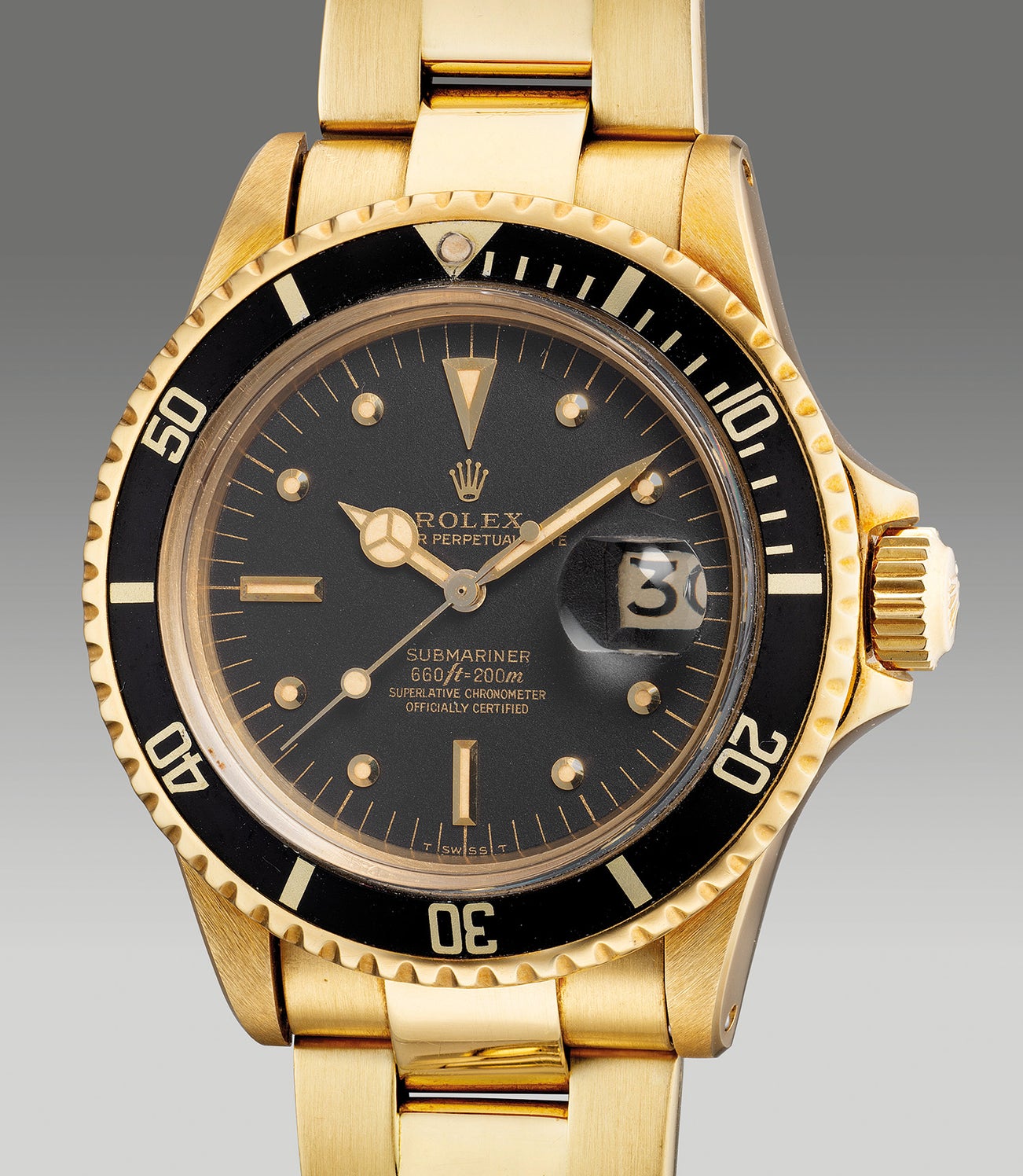 Boasting a stunning masculine appeal with a rich black dial against the deep yellow gold case, the present example bears yet another reason for collectors to fall in love with, the coveted “nipple dial”, nicknamed from the round applied gold hour indexes with smaller tritium marker. Depending on the color of the bezel, the yellow gold Submariner ref. 1680 can come with a matching black nipple dial or a matching blue nipple dial.