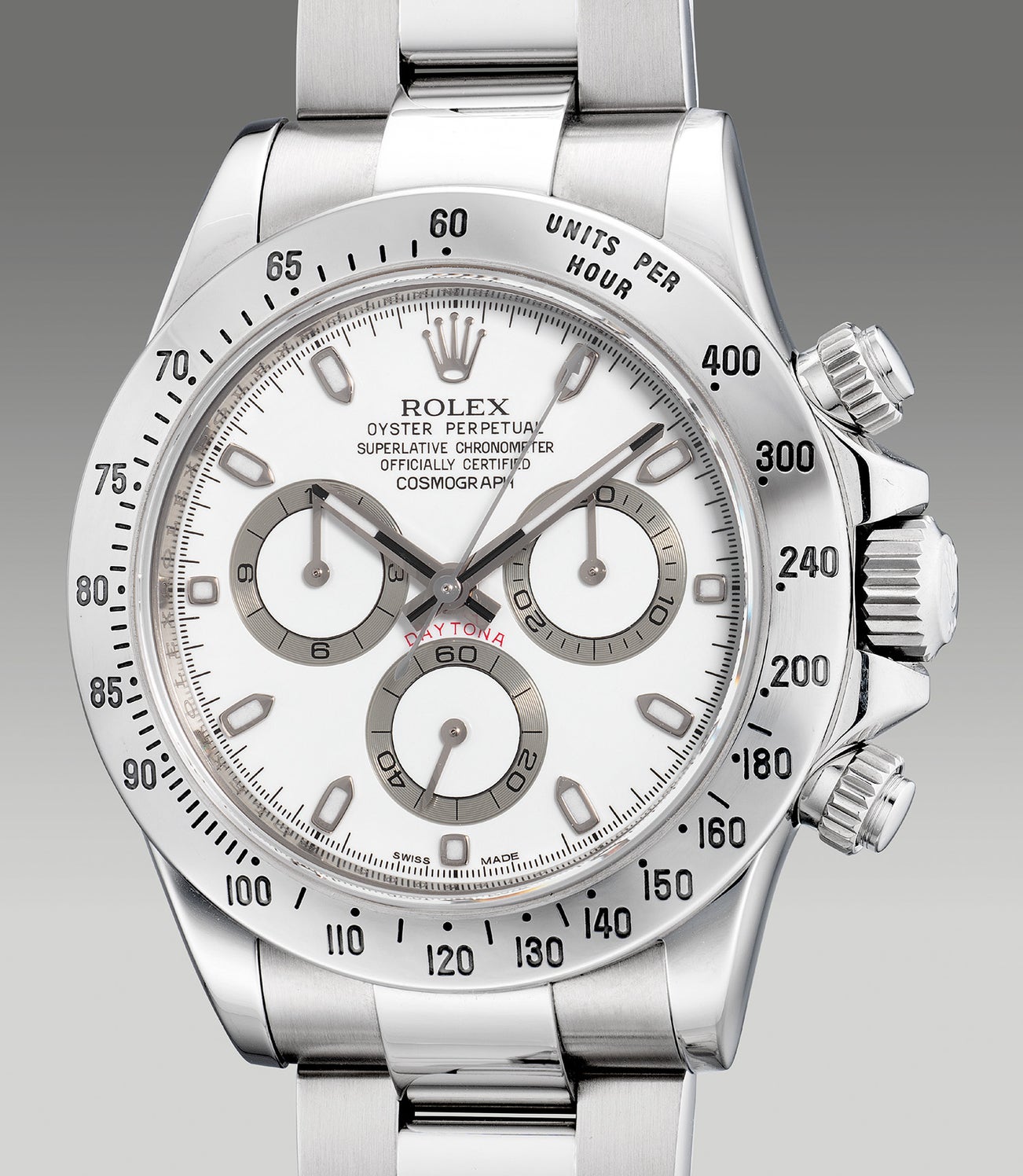 The present example is a rare variant within the 116520 family, and is nicknamed the "APH Daytona" due to its dial configuration. Produced from 2011 to 2014 approximately, this version displays a gap between the "R" and "APH" in "Cosmograph" on the dial. The present example featuring the rare trait is offered in excellent overall condition with a very well-preserved dial and is further complete with its full set of accessories. With a growing demand for these rare examples, this is the perfect opportunity for lovers of the Daytona to acquire one.
