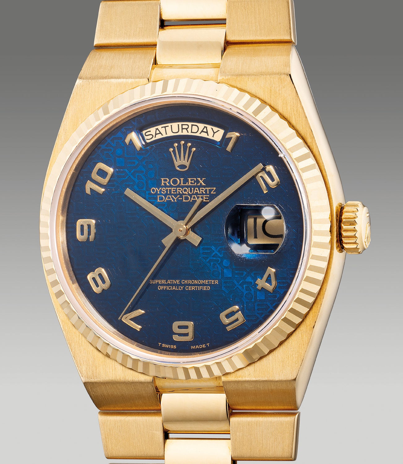 The present example Oysterquartz Day-Date ref. 19018 from circa 1987 is certainly a rare example to come across. Featuring a blue jubilee dial with applied gold Arabic hour markers, the appeal is unique and tasteful.