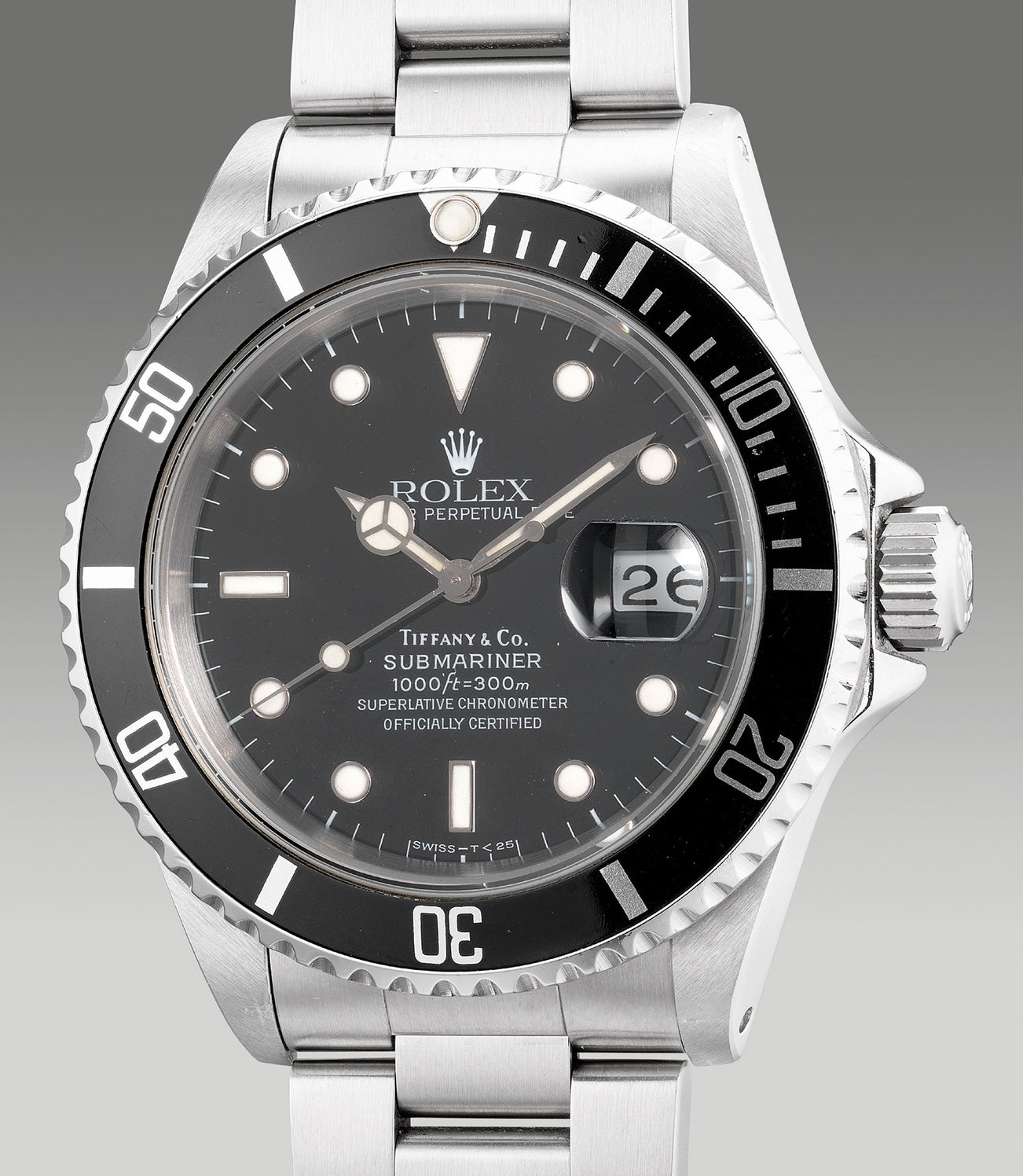 A rare and fine stainless steel diver’s wristwatch with center seconds, date, bracelet and presentation box, retailed by Tiffany & Co.