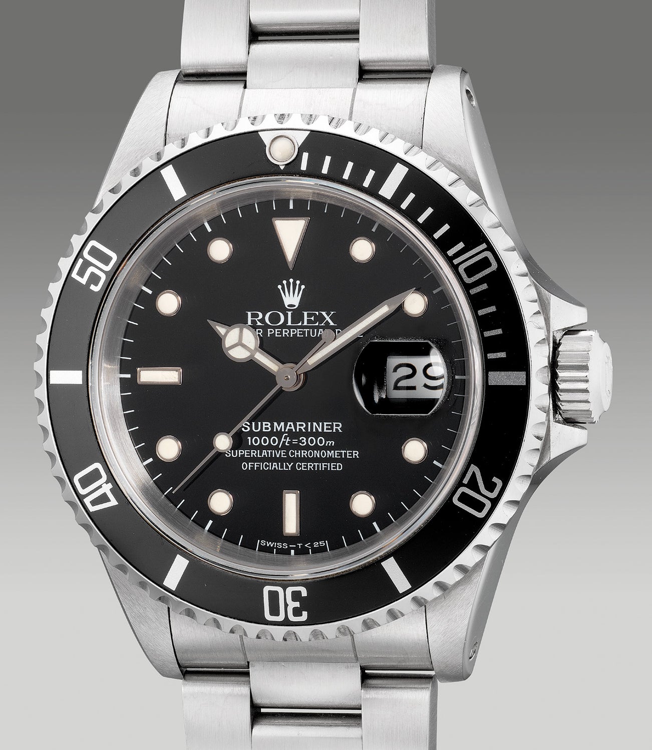 The present example Rolex Submariner ref. 16610 with an N serial from circa 1991 belongs to the early generation of the reference featuring a “SWISS-T<25” dial filled with tritium. The present lot is offered in excellent overall condition and complete with its original guarantee and presentation box.