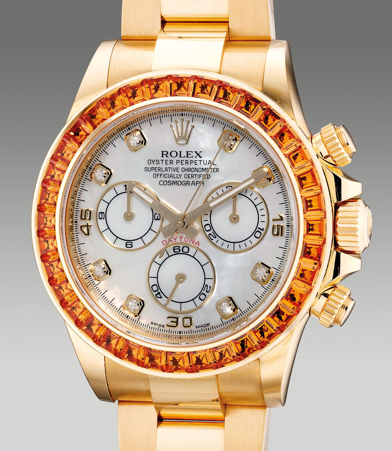 A very fine, attractive and rare yellow gold chronograph wristwatch with mother-of-pearl dial, diamond-set indexes, orange sapphire-set bezel, bracelet, guarantee and presentation box