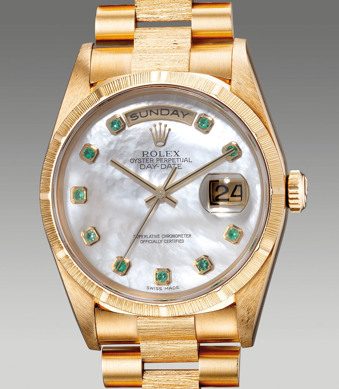 The present Rolex Day-Date ref. 18308 is the perfect predicament of the established and vibrant model. Encased in yellow gold the iconic 36mm diameter case adorned with a bark-finished bezel that is further complemented by its matching bracelet in yellow gold. Fitted with an attractive mother-of-pearl dial, the emerald-set indexes are beautifully implemented to provide a subtle yet vibrant contrast against the dial and case.