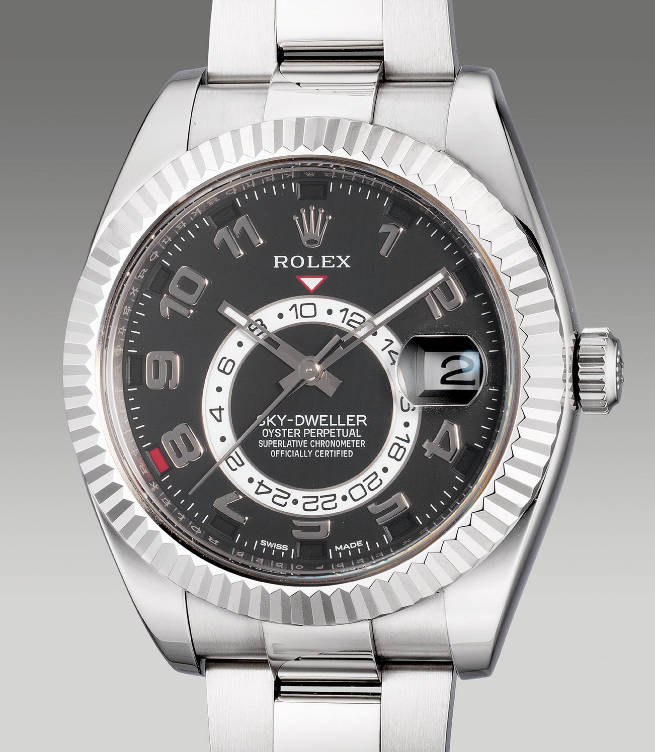 The present ref. 326939 fitted with a monochromatic appearance featuring a black dial, bold Arabic numerals and a highly legible white 24-hour disc. Furthermore, the small aperture above each hour marker cleverly indicates the month with a display of a popping contrast in red. Designed with mechanical brilliance and simplicity, the present sought-after example preserved in excellent overall condition is charmed with its original guarantee and accessories.