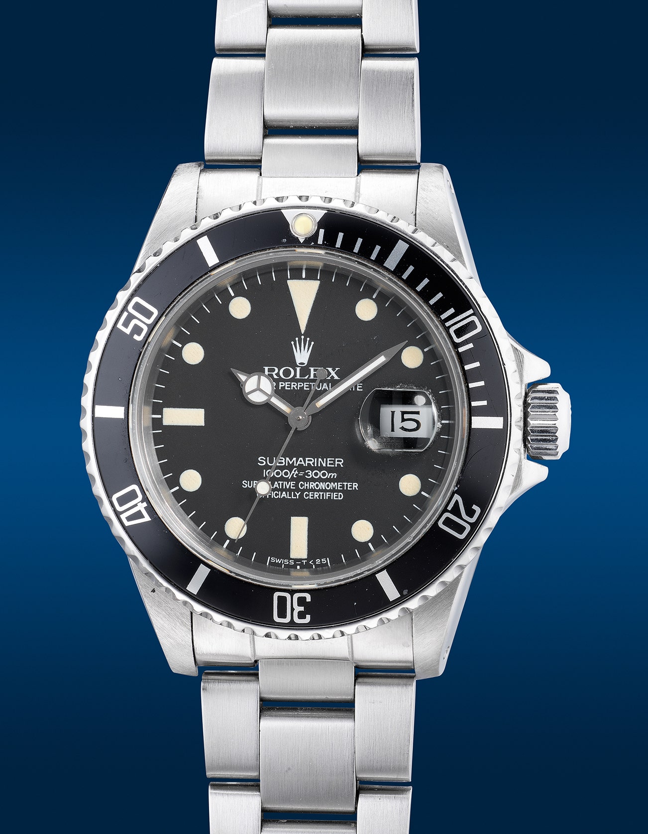 - Following the success of the ref. 1680, launched in 1967, the ref. 16800 enjoyed instant recognition as soon as it was unveiled in 1979 for being the first Submariner to be fitted with a sapphire crystal. Framed with a redesigned bezel, the update significantly elevated the model’s resistance to water, rising from a depth rating of 200 meters to 300. Integrating a matte dial into a modern case, this “Transitional Submariner” was the last of its kind to be fitted with a vintage façade. While earlier iterations of the ref. 16800 are graced with matte dials and luminous markers, such as the present lot, later variations are fitted with glossy dials with luminous, white gold markers.