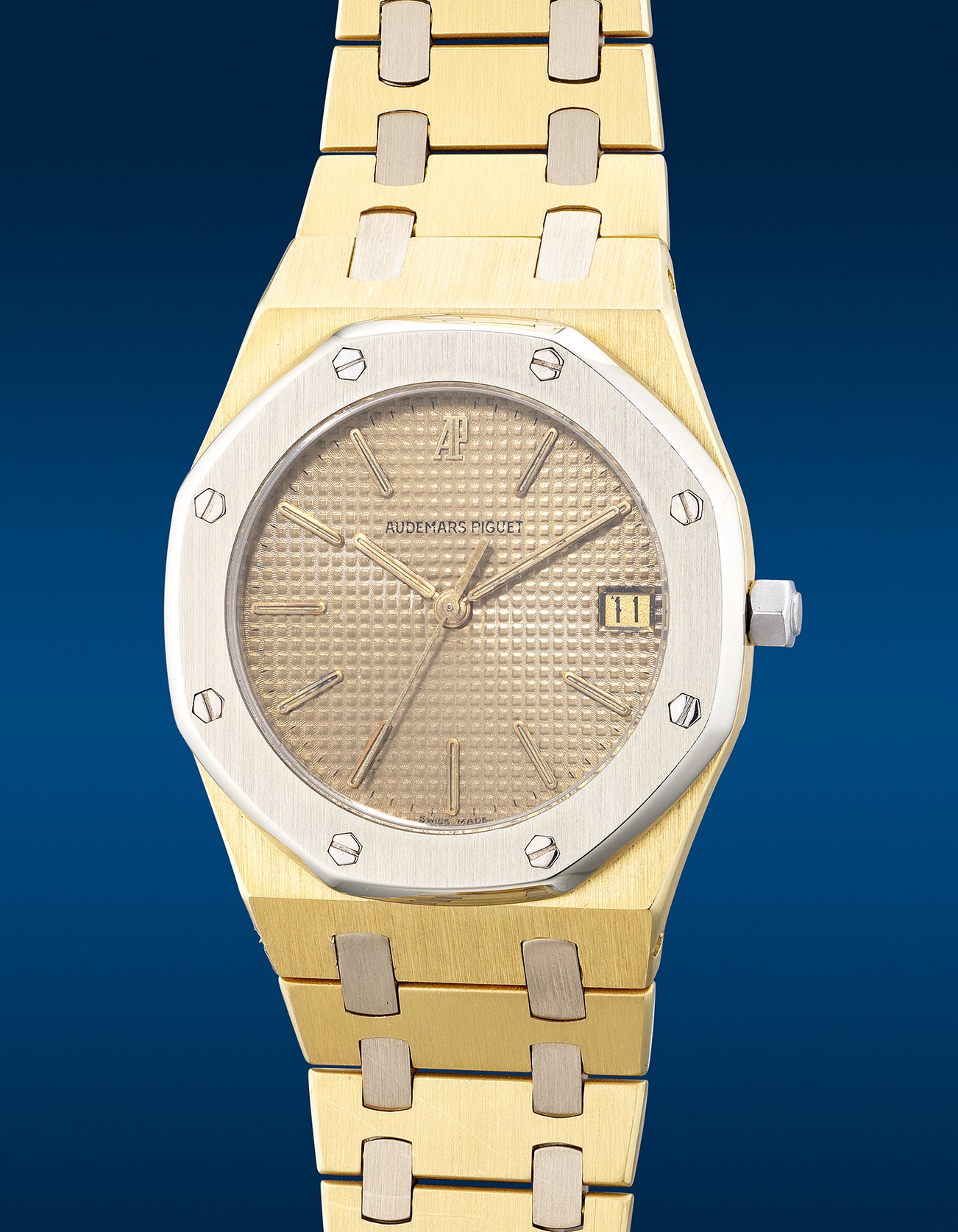 - The present Royal Oak Quartz is an exceedingly rare variant, armoured in an inverted white gold and yellow gold livery, powered by the cal. 2506. Unlike standard issues, this piece is fitted with a white gold bezel, contrasted by a yellow gold case with a matching integrated bracelet with white gold links. Sporting a tone-on-tone tapisserie dial, the golden backdrop is layered with the desired features of a first series dial, featuring distinct lume-filled baton hands and hour markers, further delivered with a flat Audemars Piguet signature.