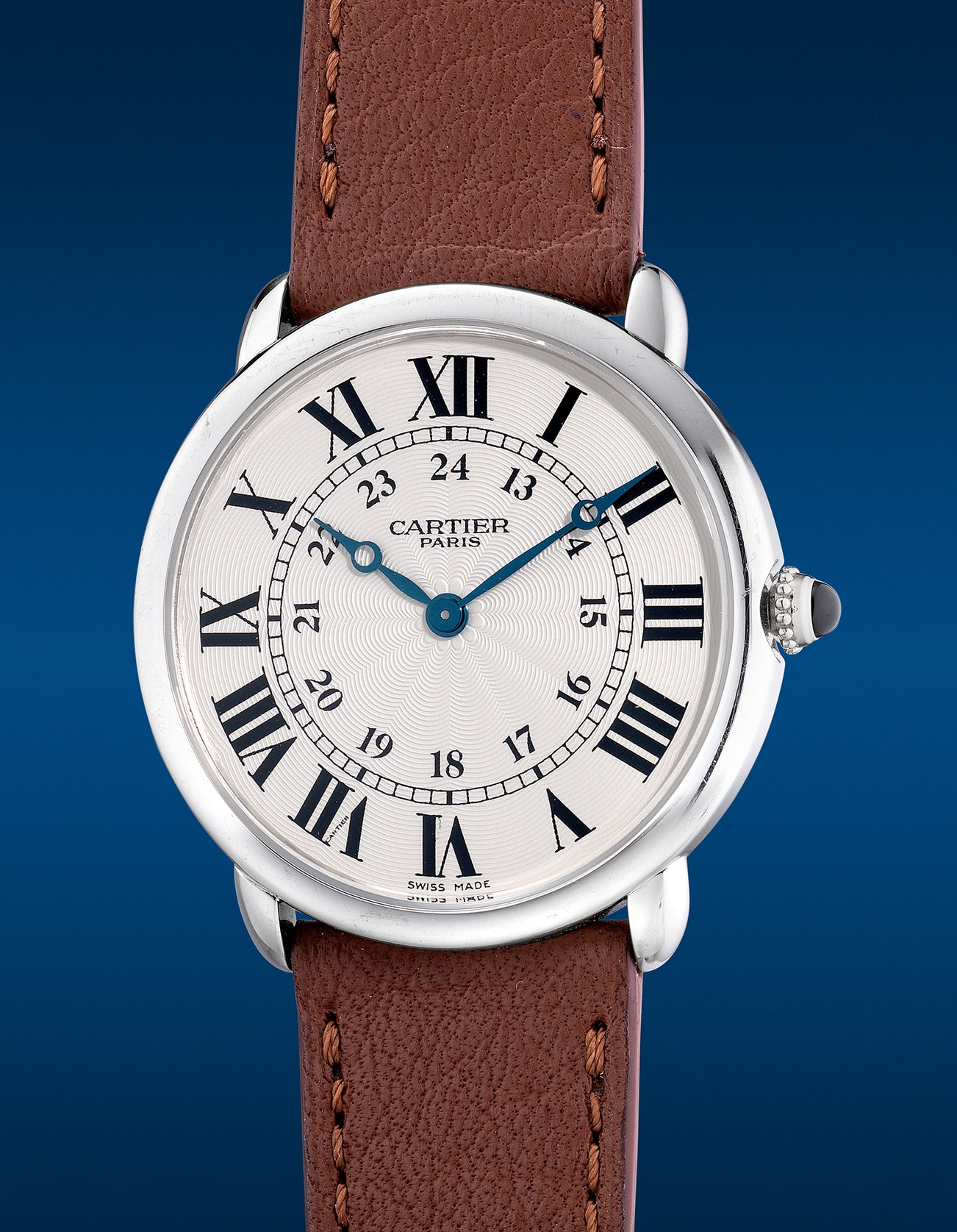 - Drawing from the style of rounded examples in the 1930s, the Ronde Louis Cartier was introduced in the mid 2000s with a contemporary 33mm case. The solid, two-body case is polished with a rounded bezel, downturn lugs, and the crown is set with a sapphire cabochon. Boasting an elegant guilloche dial, the stage is set with painted black radial Roman numeral hour markers, complemented with blued steel hands. The inner minute track perfectly frames the 24-hour indication displayed in Arabic numerals.