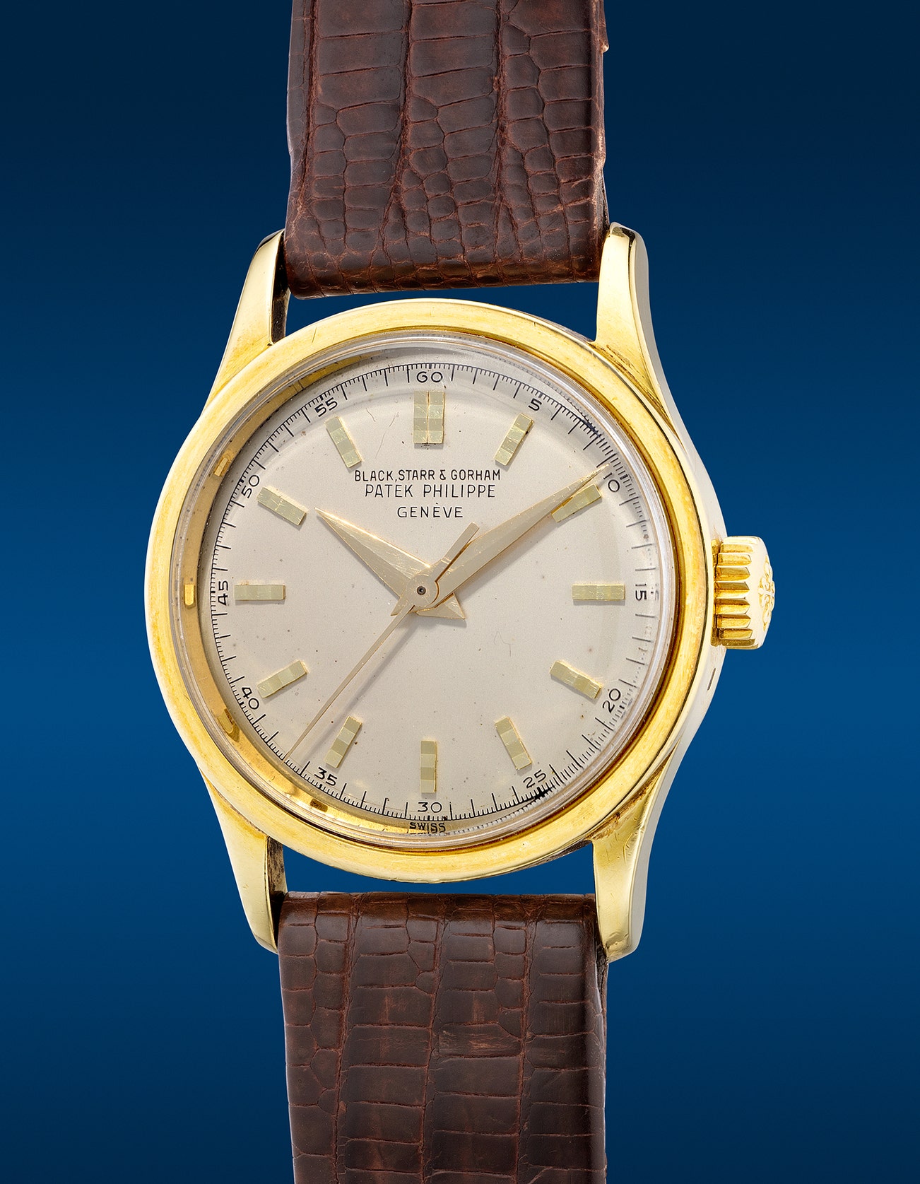 - Preserved in an attractive overall condition and delivered with a Patek Philippe Extract from the Archives, this is a great opportunity for lovers of vintage Calatravas to acquire an early example of the water-resistant reference. According to our research, only 39 yellow gold examples of the ref. 2555 are known to the market. Adding to its rarity, the present dial is also one of 16 Patek Philippe examples known to be double signed with Black, Starr & Gorham, a New York based retailer with a rich heritage that dates back to 1810. Furthermore, the Black, Starr & Gorham signature corresponds with the “HOX” code stamped on the bridge of the movement, confirming that the present example was made for the American market.