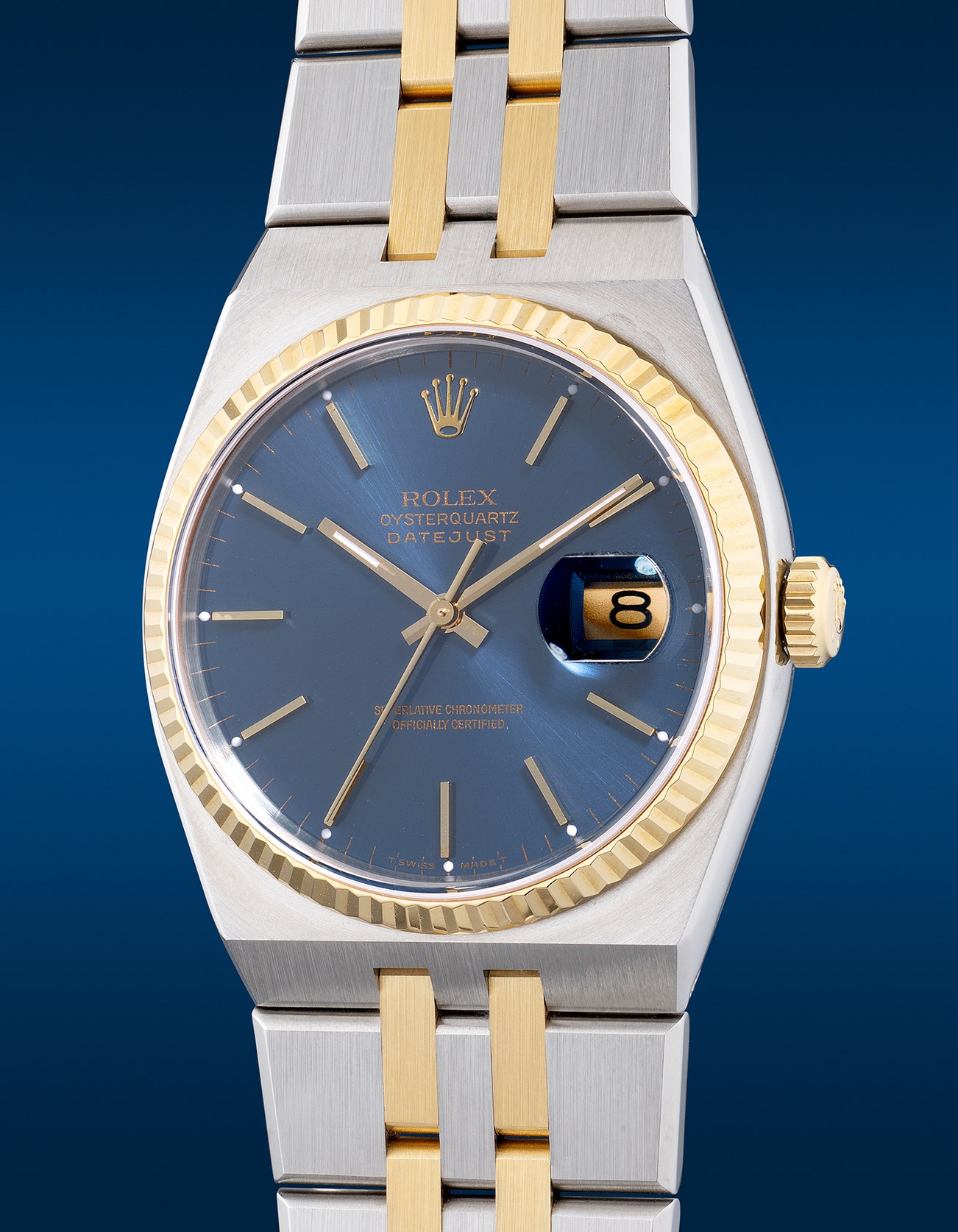 - The present Rolex Oysterquartz Datejust ref. 17013 is an early and interesting example from circa 1977. Boasting a brilliant blue dial, the watch is dressed in a radiant two-tone livery that instantly brightens up its cool, dark visage. According to the original owner, Rolex was able to restore the timepiece to its former glory after being serviced by the manufacturer. Retaining its original movement, the current ref. 17013 is therefore offered in a sparking “like-new” condition, sporting crisp edges and sharp bevels.