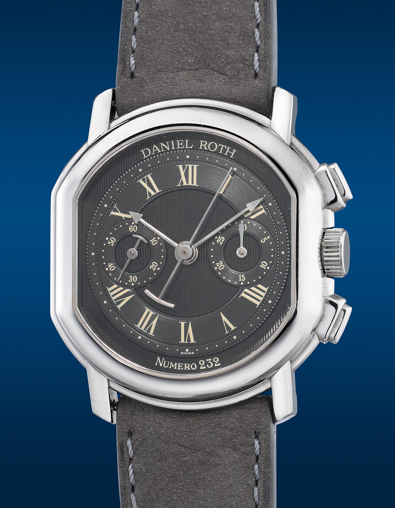 - The dial is signed with “DANIEL ROTH” at 12 o’clock and the watch’s unique number, “NUMERO 232”, is positioned at 6 o’clock. The lance-shaped hands, another visual inspiration from the Abraham-Louis Breguet, are fashioned in steel.