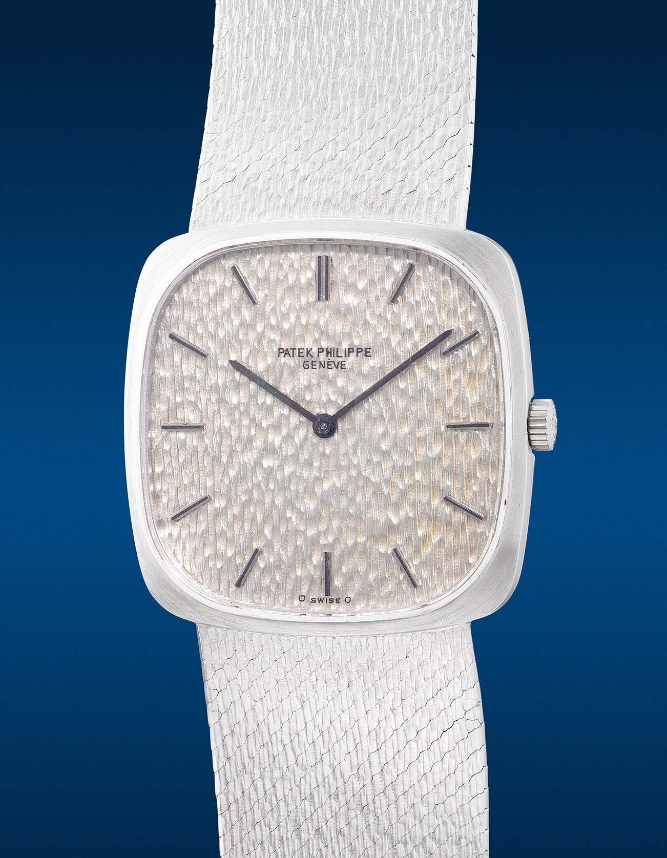 - Boasting prominent Patek Philippe proportions, the present example further stands out with its exquisite bark-finished silvered dial and a matching integrated herringbone bracelet, providing a seamless connection that complements the dial. Encased in white gold measuring at a 28mm long and 28mm wide, the watch is fitted with a thin cal. 175 which allows for a slim profile that can slide through any tight cuff.