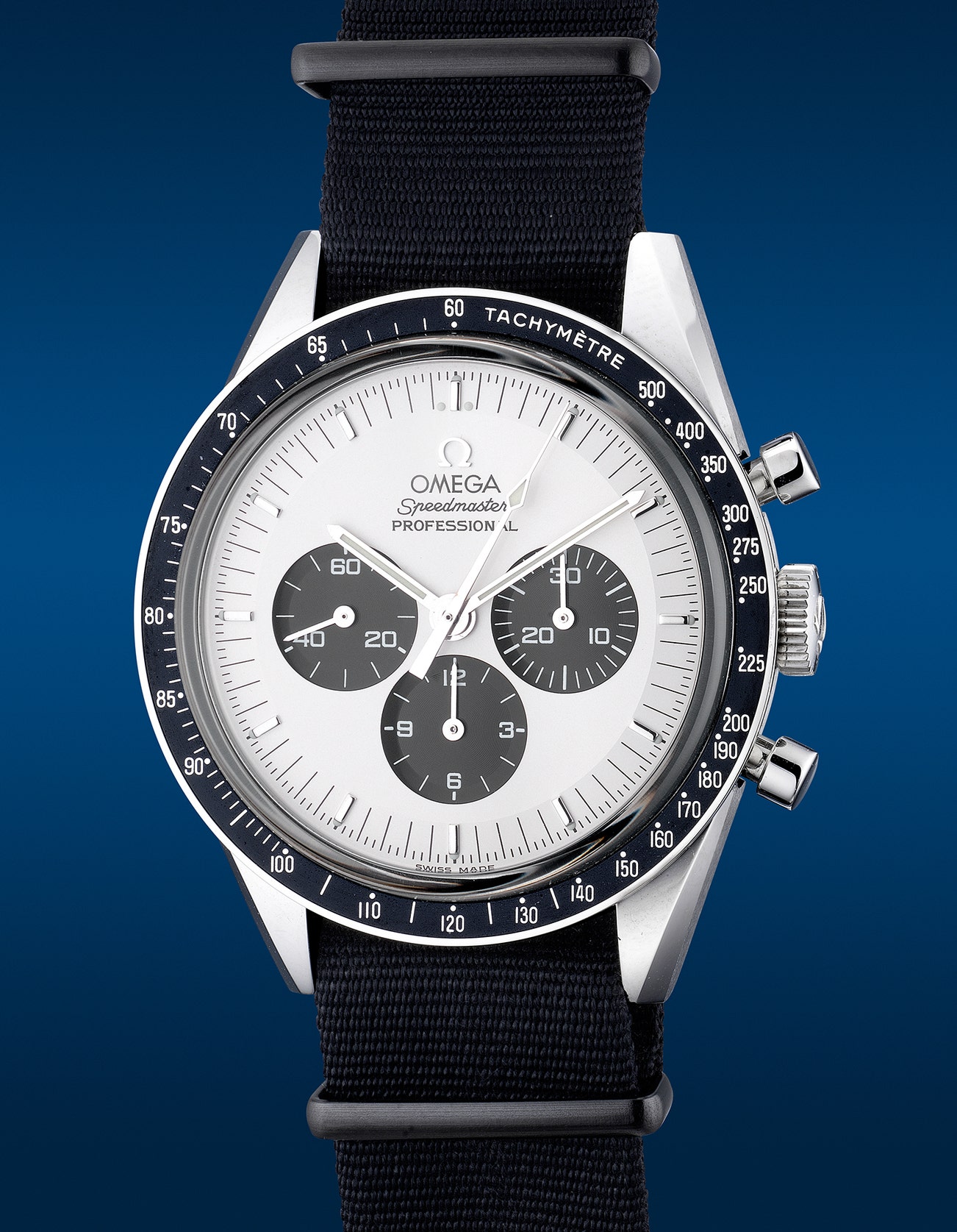 - Boasting a unique flair, the present example has been tailored to the original owner’s taste, flaunting a dual-tone Omega Mitsukoshi “panda” dial, paired with a black nylon strap that emphasises the black registers.