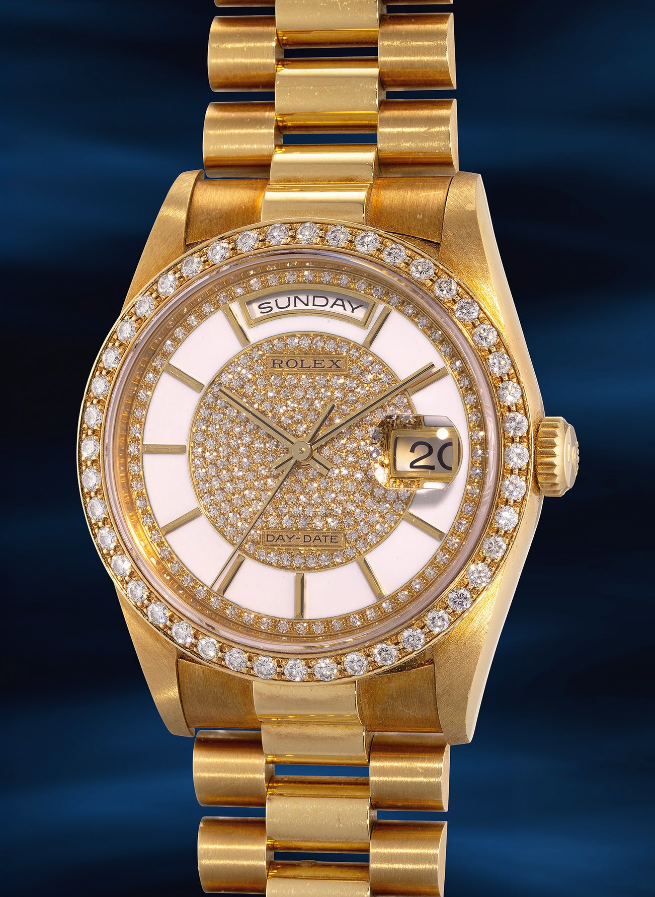 An extremely rare and well-preserved yellow gold and diamond-set wristwatch with center seconds, day, date, pavé diamonds-set and white enamel dial, bracelet, guarantee and presentation box