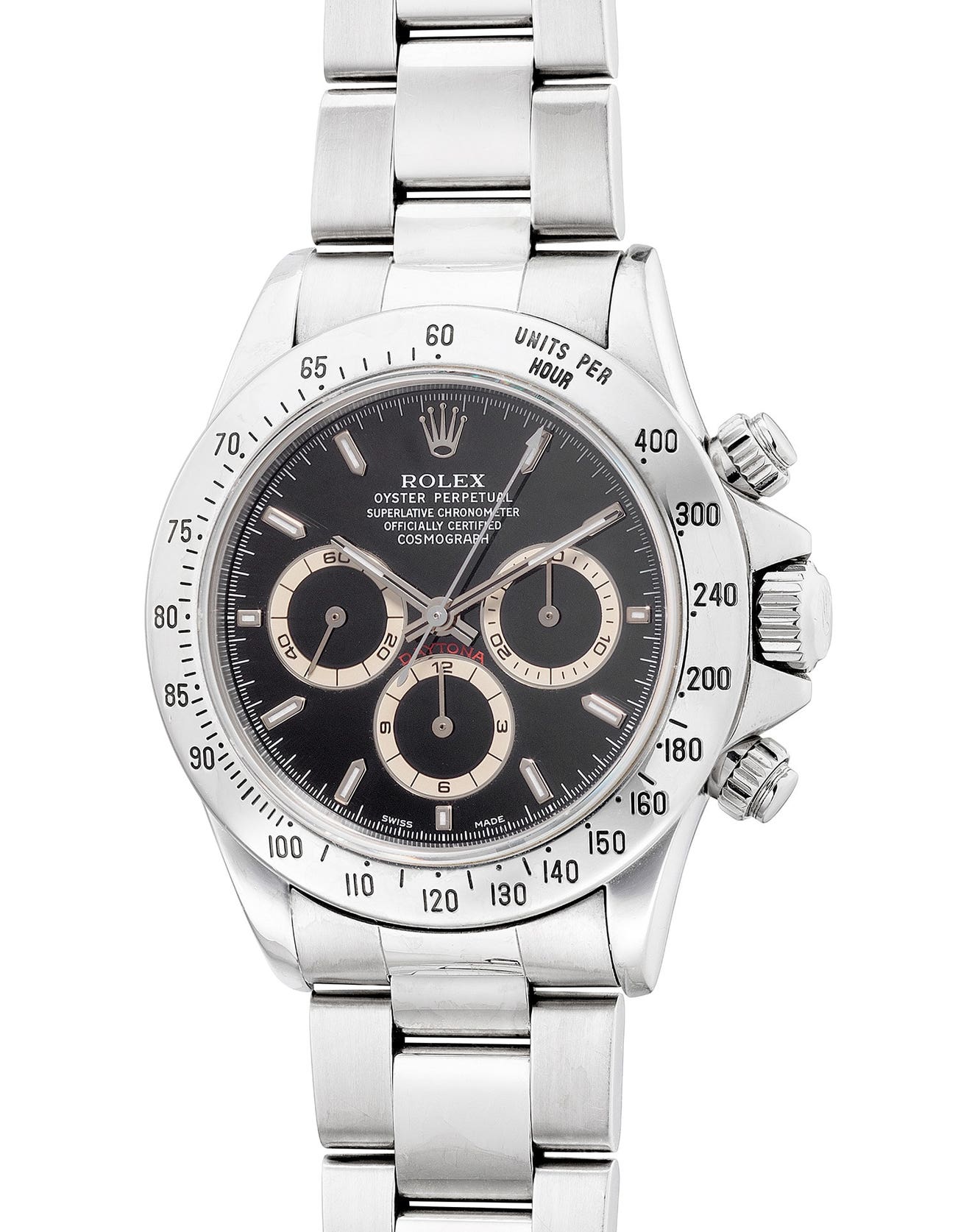 The present example is a Rolex Cosmograph Daytona in stainless steel that features a desirable "tropical" registers developed through age across examples fitted with black dial, the present lot displays a uniformed tropicalization making it highly desirable and sought after by collectors.